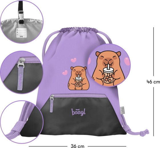 Štýlové a funkčné vrecko Baagl s motívom kapybara sa hodí na prezuvky, športové vybavenie aj veci na krúžky. Odolný a ľahko umývateľný materiál zabezpečuje dlhú životnosť, zatiaľ čo praktické predné vrecko na zips udrží kľúče, peňaženku alebo drobnosti pekne po ruke.