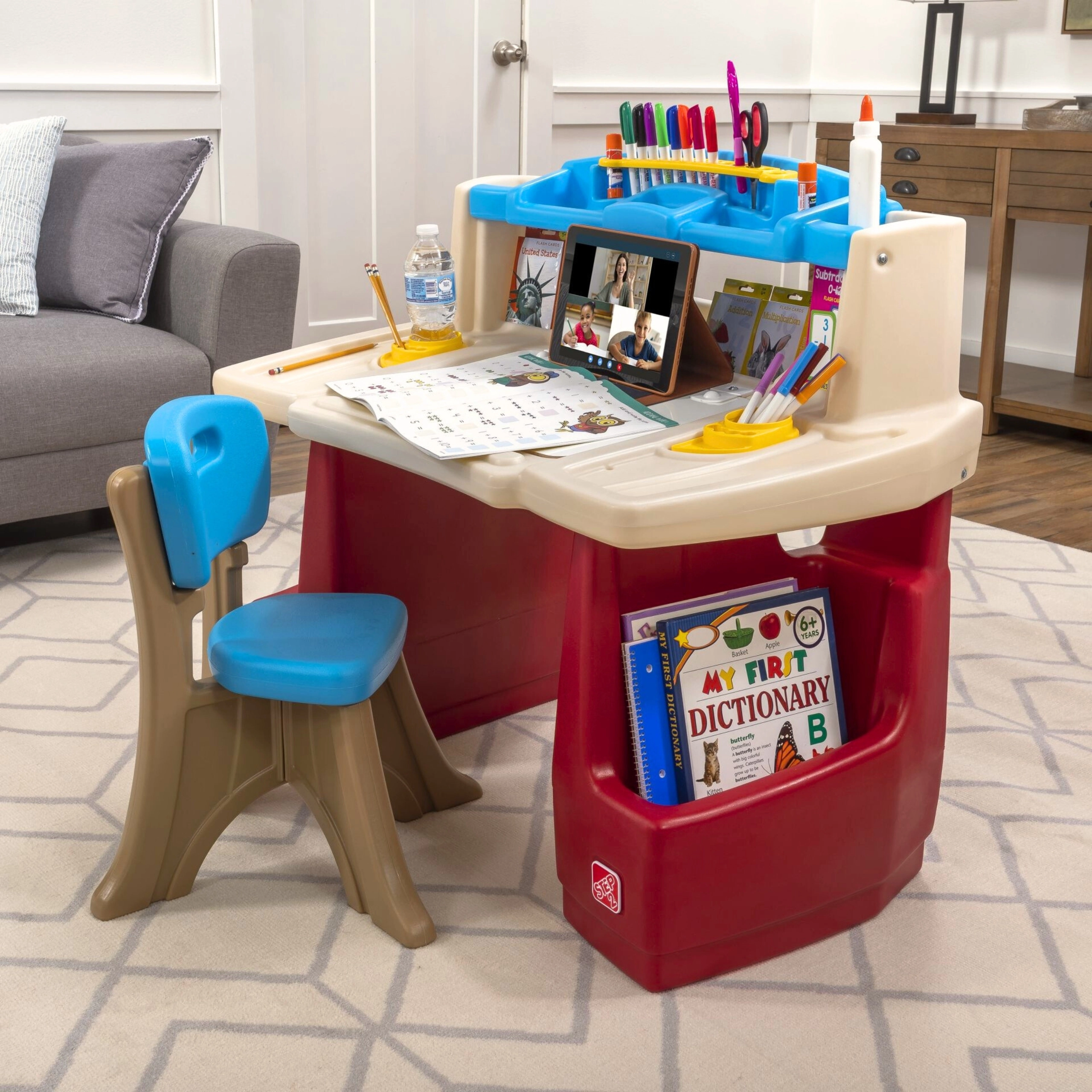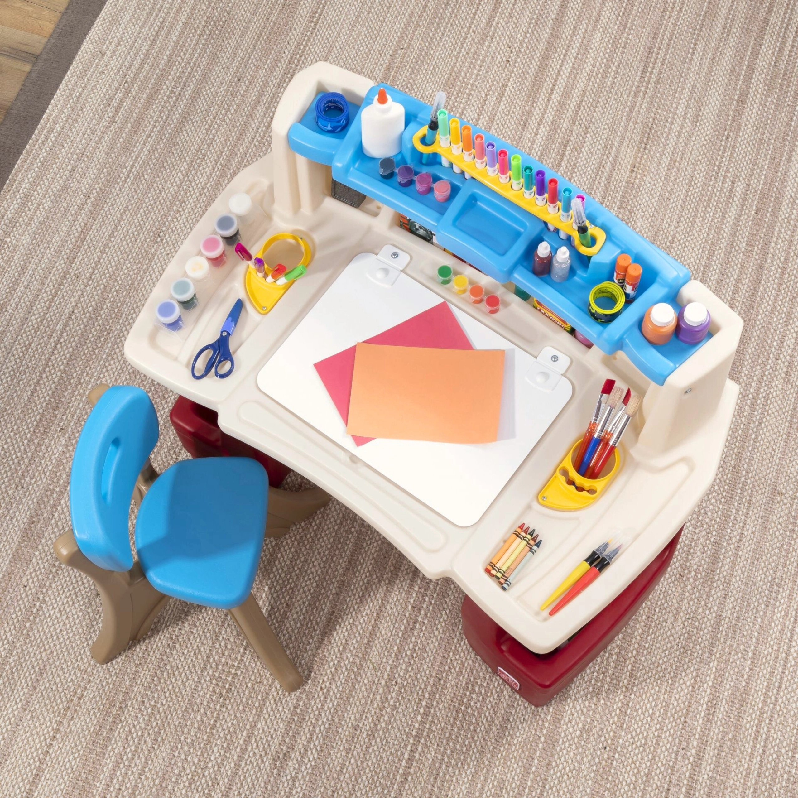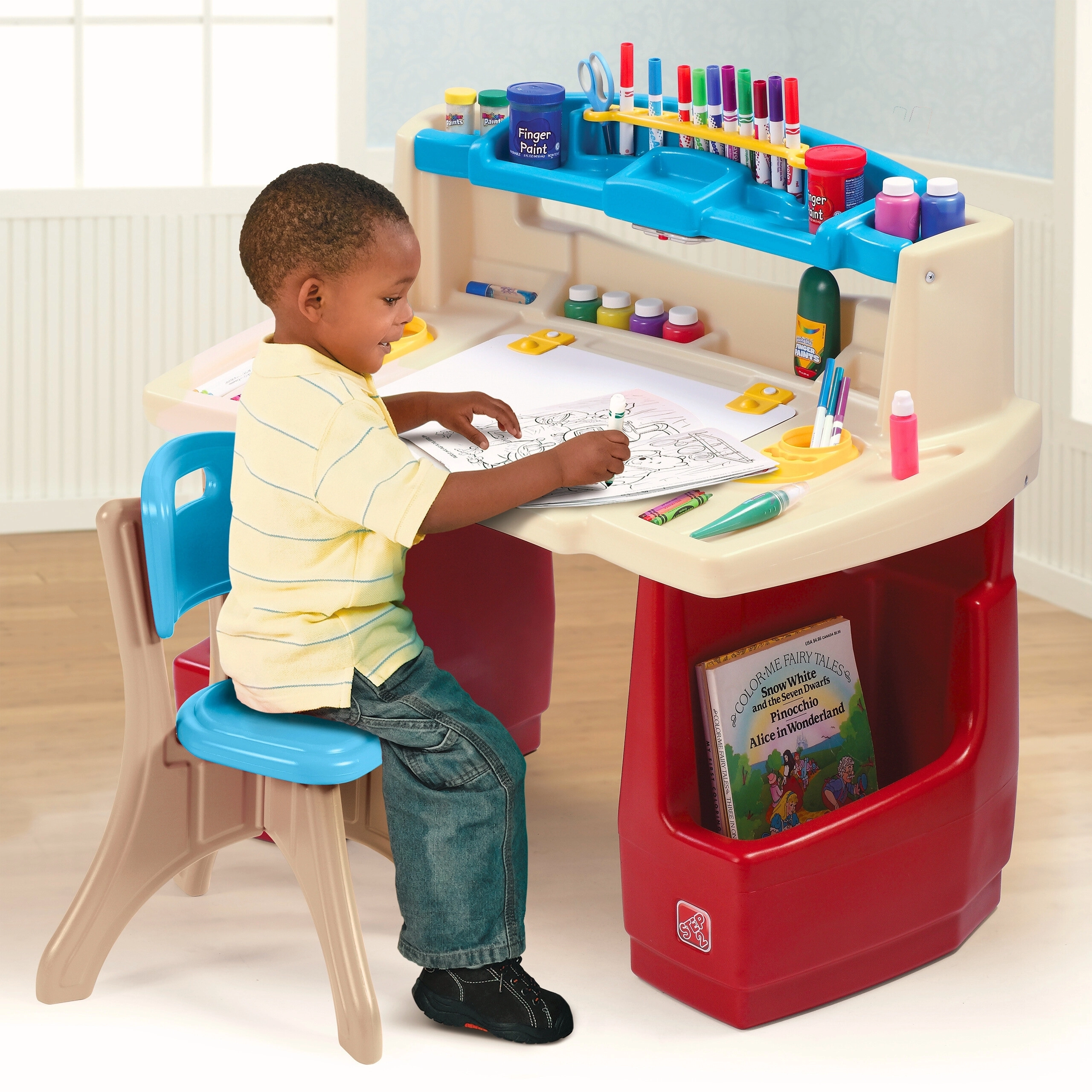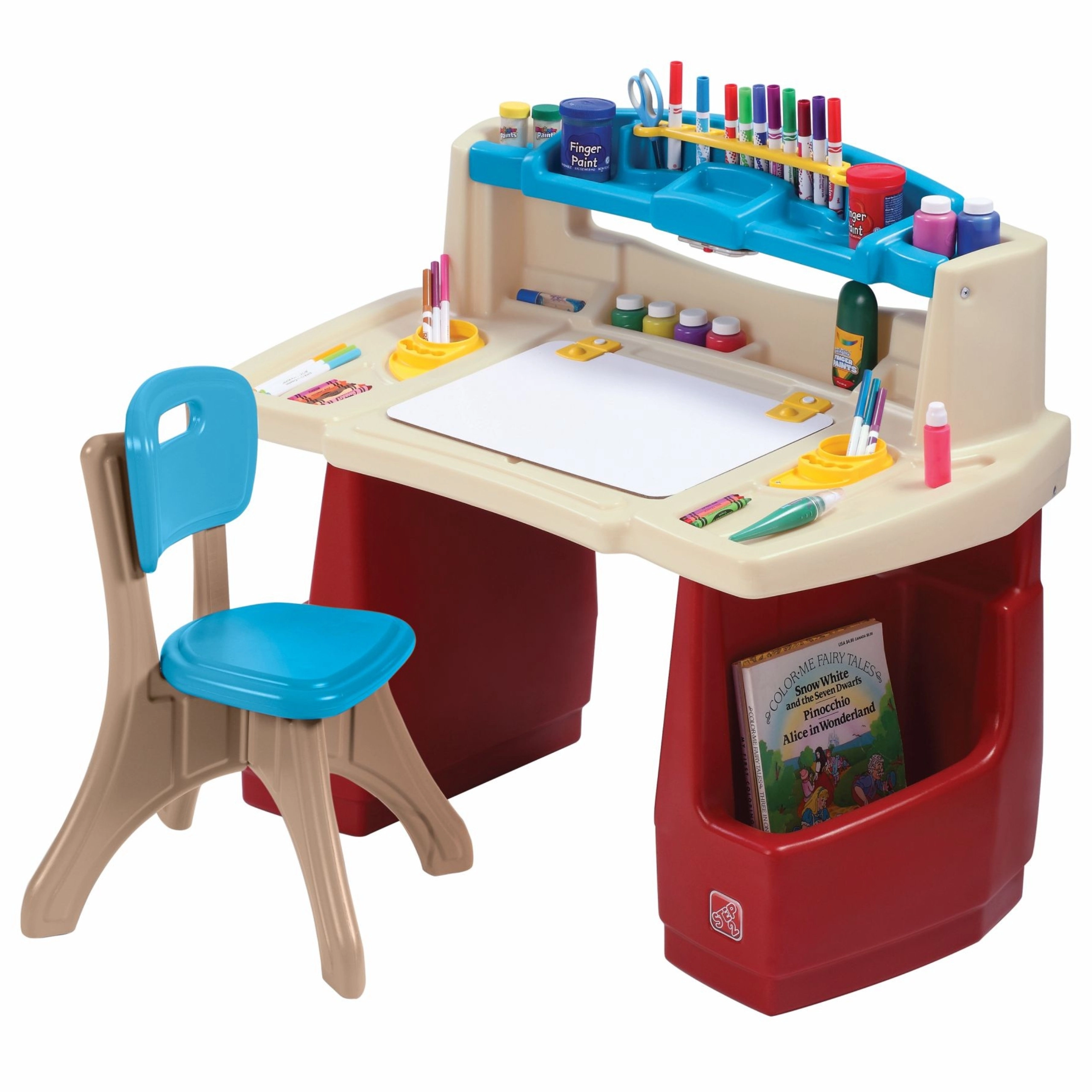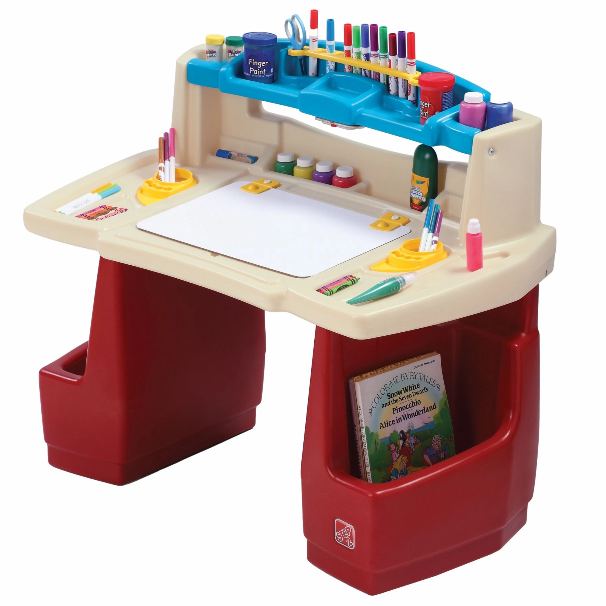 Set STEP2 Deluxe Art Master premení detskú izbu na inšpiratívny ateliér. Deti majú k dispozícii veľký pracovný priestor s výklopnou mazacou tabuľou na sucho, ktorá sa ľahko čistí a ukrýva ďalšie miesto na pomôcky. Horný organizér, bočné koše a zvislé priehradky udržia pastelky, farby, knihy aj tablet vždy po ruke.
