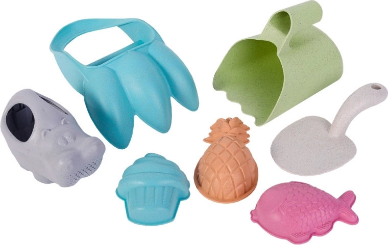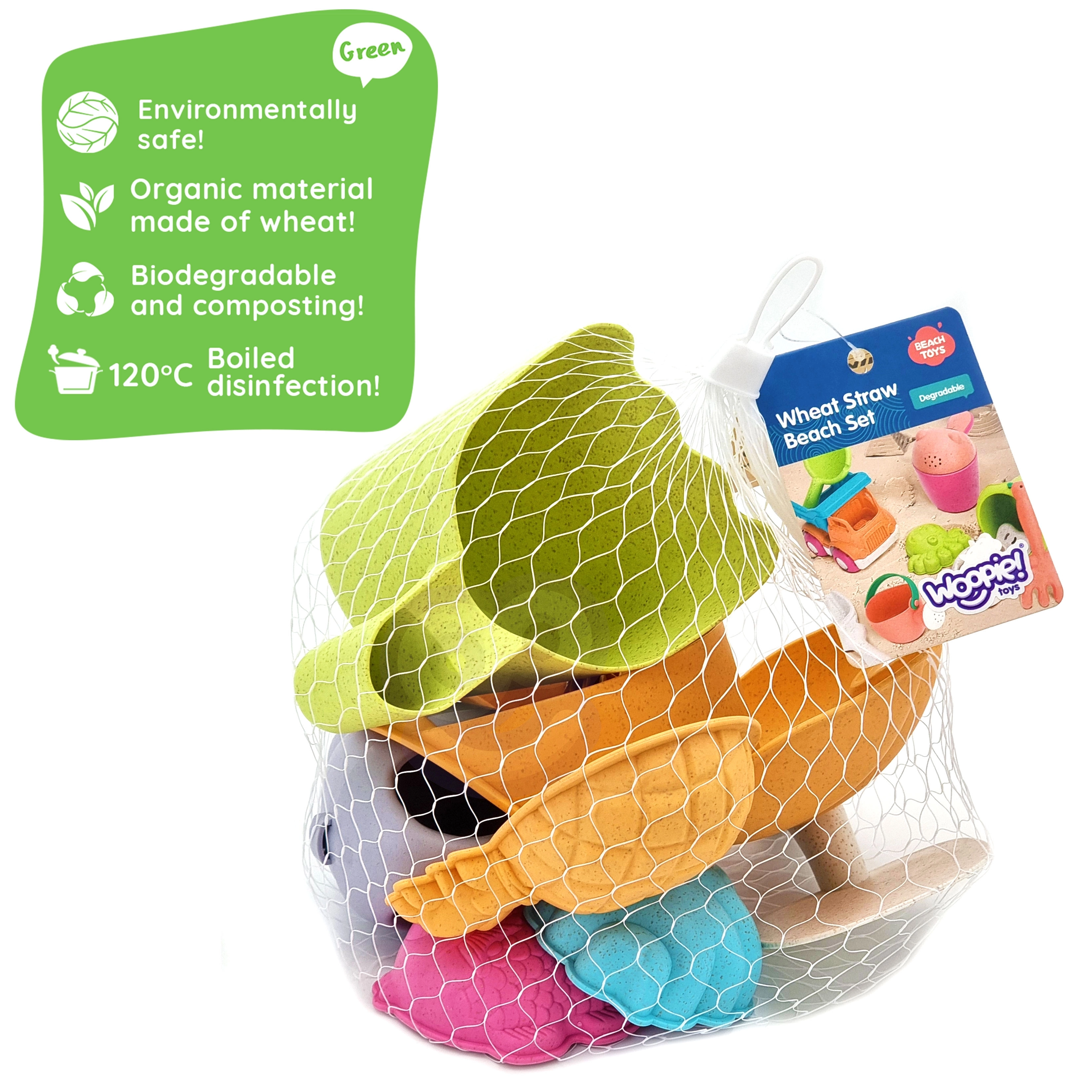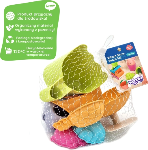 Ekologická sada do piesku WOOPIE GREEN poteší deti od 3 rokov aj rodičov, ktorým záleží na prírode. Obsahuje 7 praktických dielov v pastelovom dizajne: pazúry do piesku, veľkú lyžicu, kanvičku, 3 formičky, lopatku a hrable. Vyrobené z organického, biologicky rozložiteľného materiálu, vhodné na kompostovanie a bezpečné pre deti (dezinfikované pri 120 °C) – ideálne do pieskoviska, na pláž aj do záhrady.