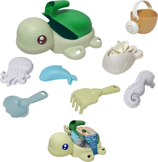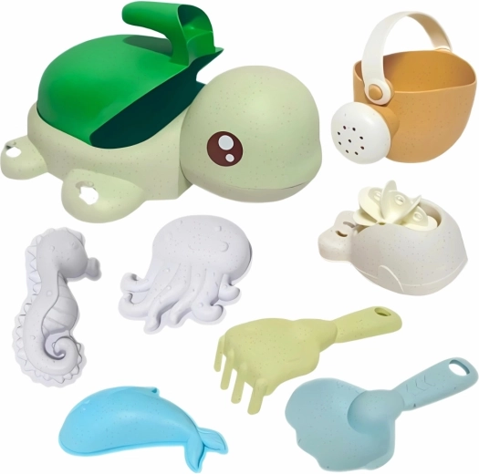Čo v sade nájdete: vedierko/korytnačku s prísavkami, krhlu, lopatku, hrabličky, lyžicu, koleso mlynček a 3 formičky (morské živočíchy). Pastelové farby a oblé tvary sú prívetivé aj pre menšie deti od 3 rokov. Materiál je biologicky rozložiteľný a kompostovateľný, takže sa deti hrajú zodpovedne k prírode.