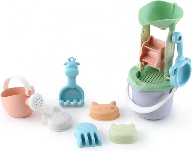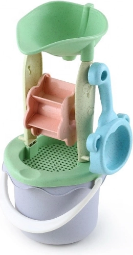 - 9-dielny set: vedierko, mlynček so sitkom, kanvička, 4 formičky, lopatka a hrabličky