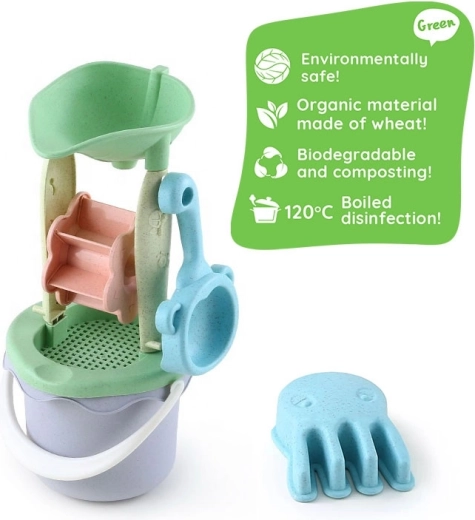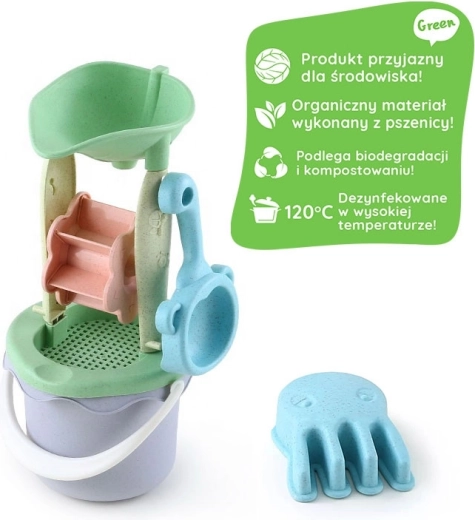 Detská sada na piesok Woopie Green prináša zábavu do piesku aj vody v ekologickom prevedení. Obsahuje 9 dielov vrátane vedierka, mlynčeka so sitkom, kanvičky, formičiek, lopatky a hrabličiek. Všetko je z organického a biologicky rozložiteľného materiálu s pastelovým dizajnom. Diely majú pohodlné úchyty a sú bezpečné pre deti – dezinfikované pri 120 °C. Ideálne do pieskoviska, na pláž aj do záhrady.