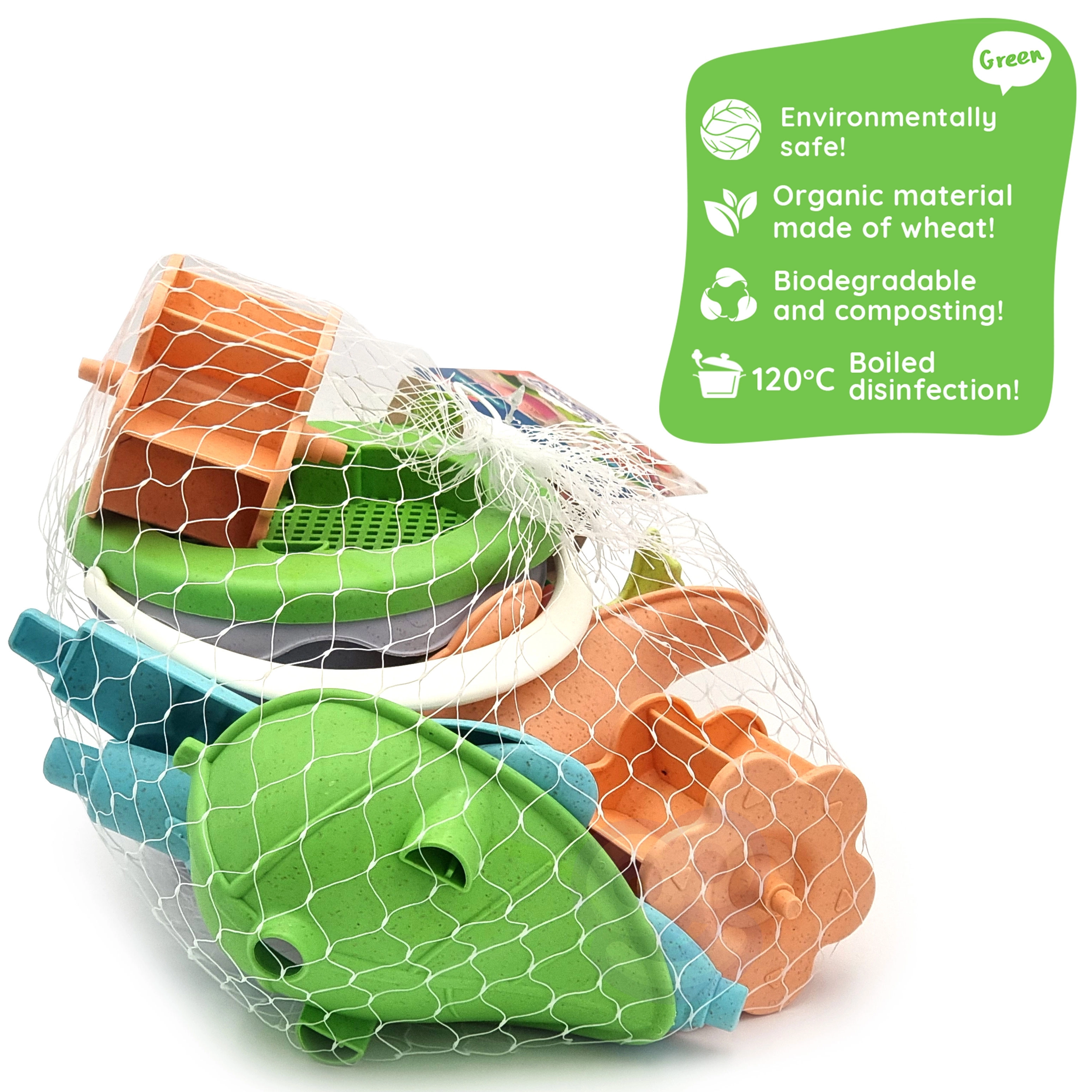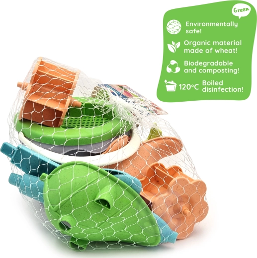 Sada je vyrobená z organického, biodegradabilného materiálu na rastlinnej báze, ktorý je kompostovateľný. Hladké tvary, odolný plast a jednoduchá údržba zabezpečujú bezpečné a dlhodobé používanie. Pastelové farby potešia deti aj rodičov a zároveň sa skvele hodia k ďalším plážovým hračkám.