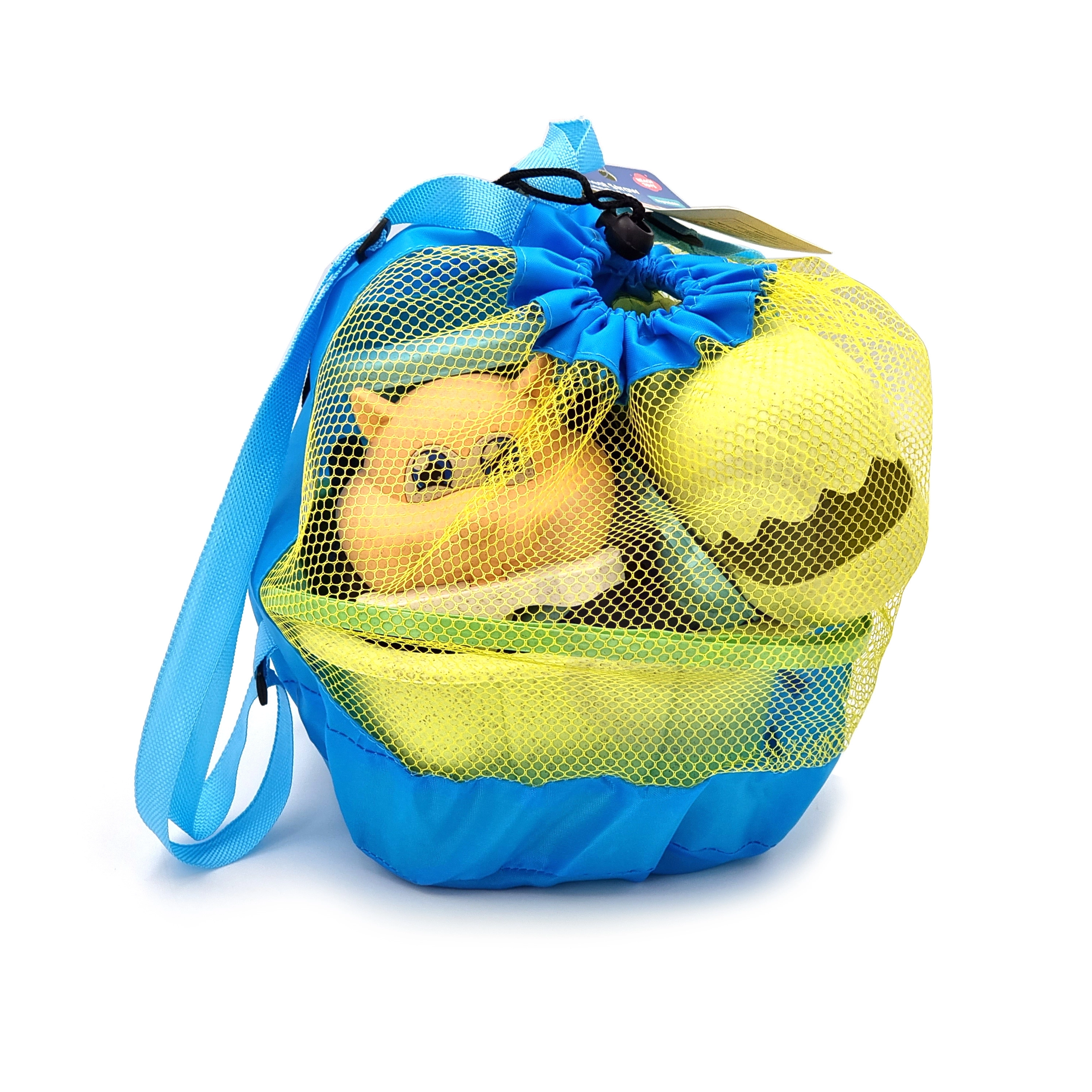 Ľahký sieťovaný vak slúži ako batoh – jednoduché prenášanie, rýchle odkvapkanie a sušenie hračiek, menej piesku v taške po ceste z pláže.