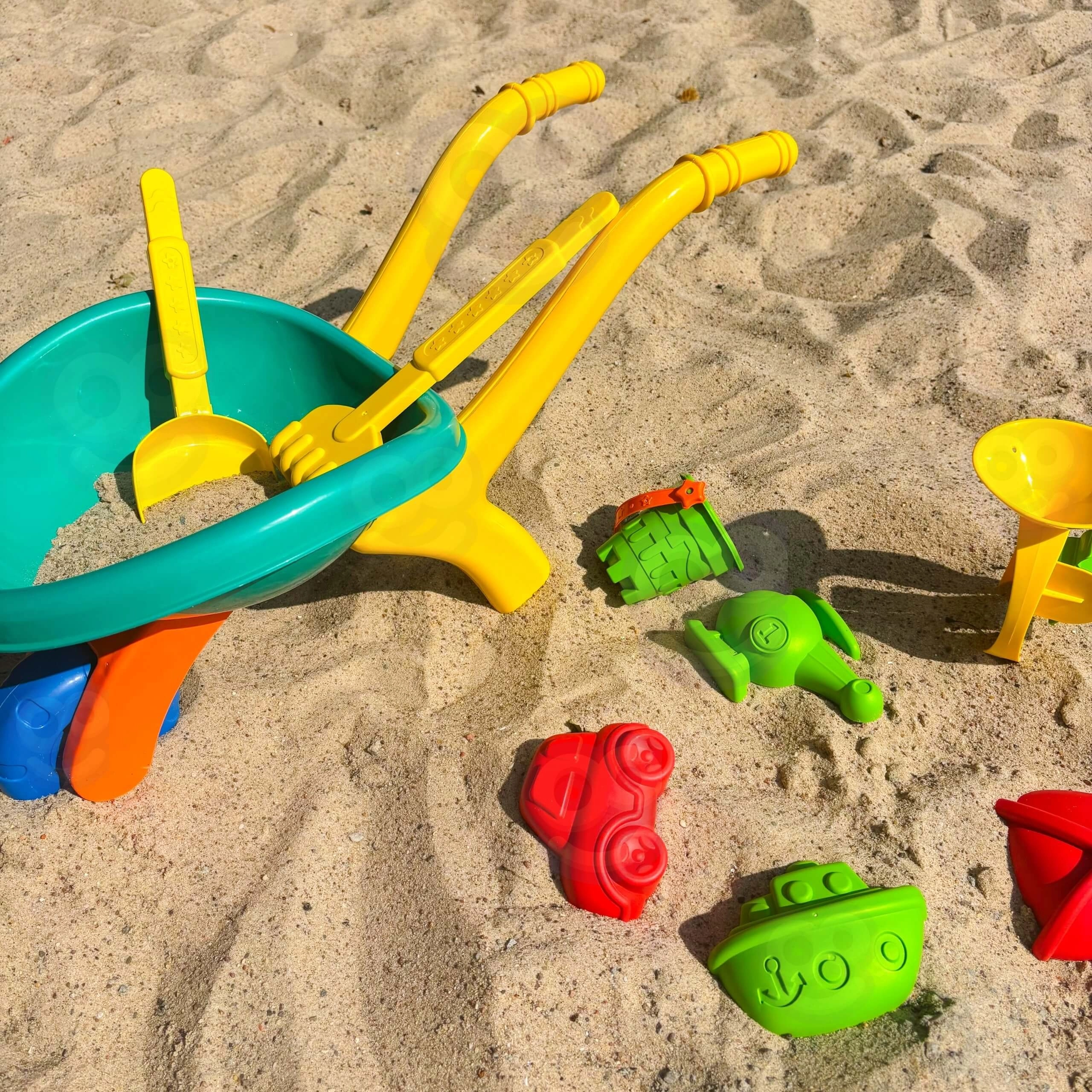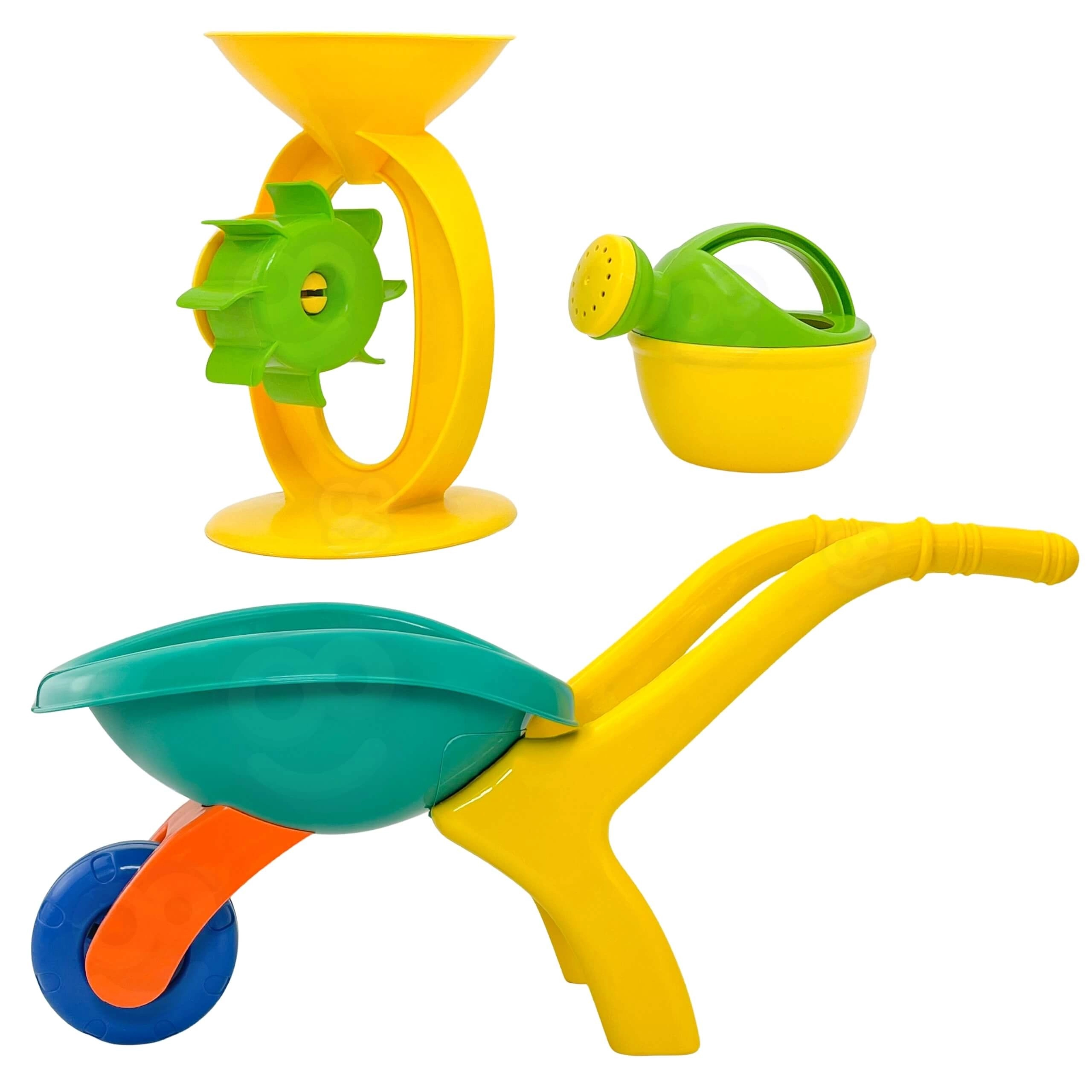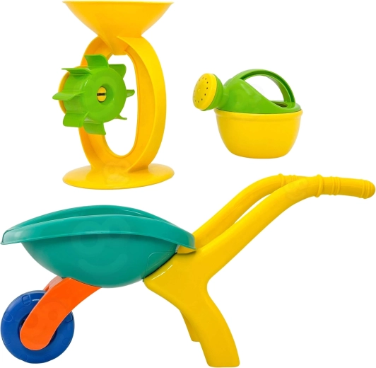 - 1× detský fúrik, 1× pieskový/vodný mlynček, 1× kanvička, 1× vedro, 1× lopatka, 1× hrable, 4× formička