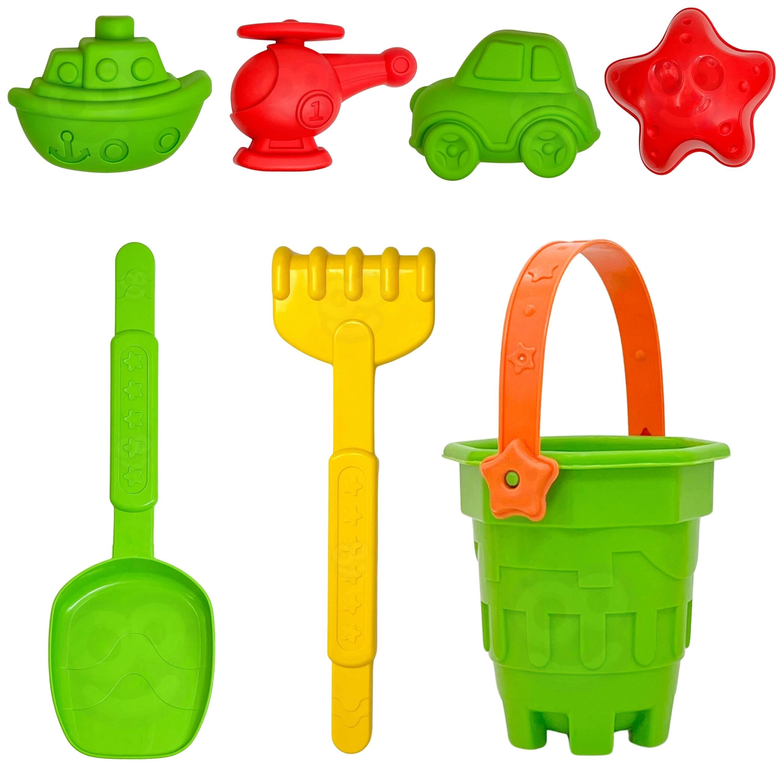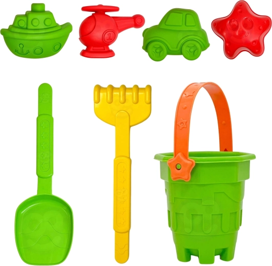 Lopatka, hrable, vedro a 4 formičky v tvare dopravných prostriedkov a hviezdy podporujú kreatívne stavenie a zmyslovú hru.