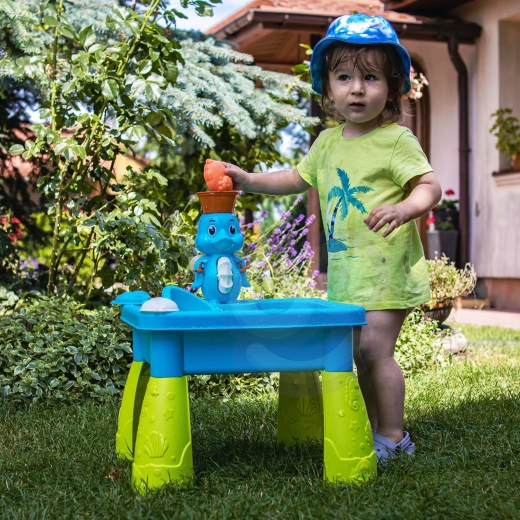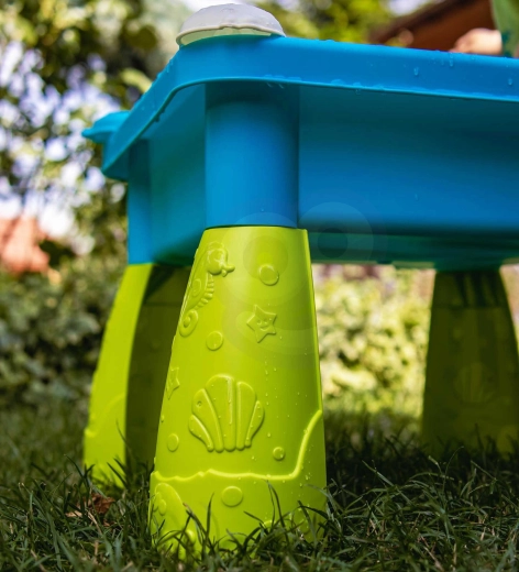 Stolík je dostatočne stabilný na hru na záhrade, terase aj v detskej izbe. Vďaka bohatej sade doplnkov môžu deti naberať, prelievať, formovať aj tvoriť vlastné vodné experimenty. Jednoduchá montáž a skladná konštrukcia zjednoduší prenášanie aj ukladanie.
