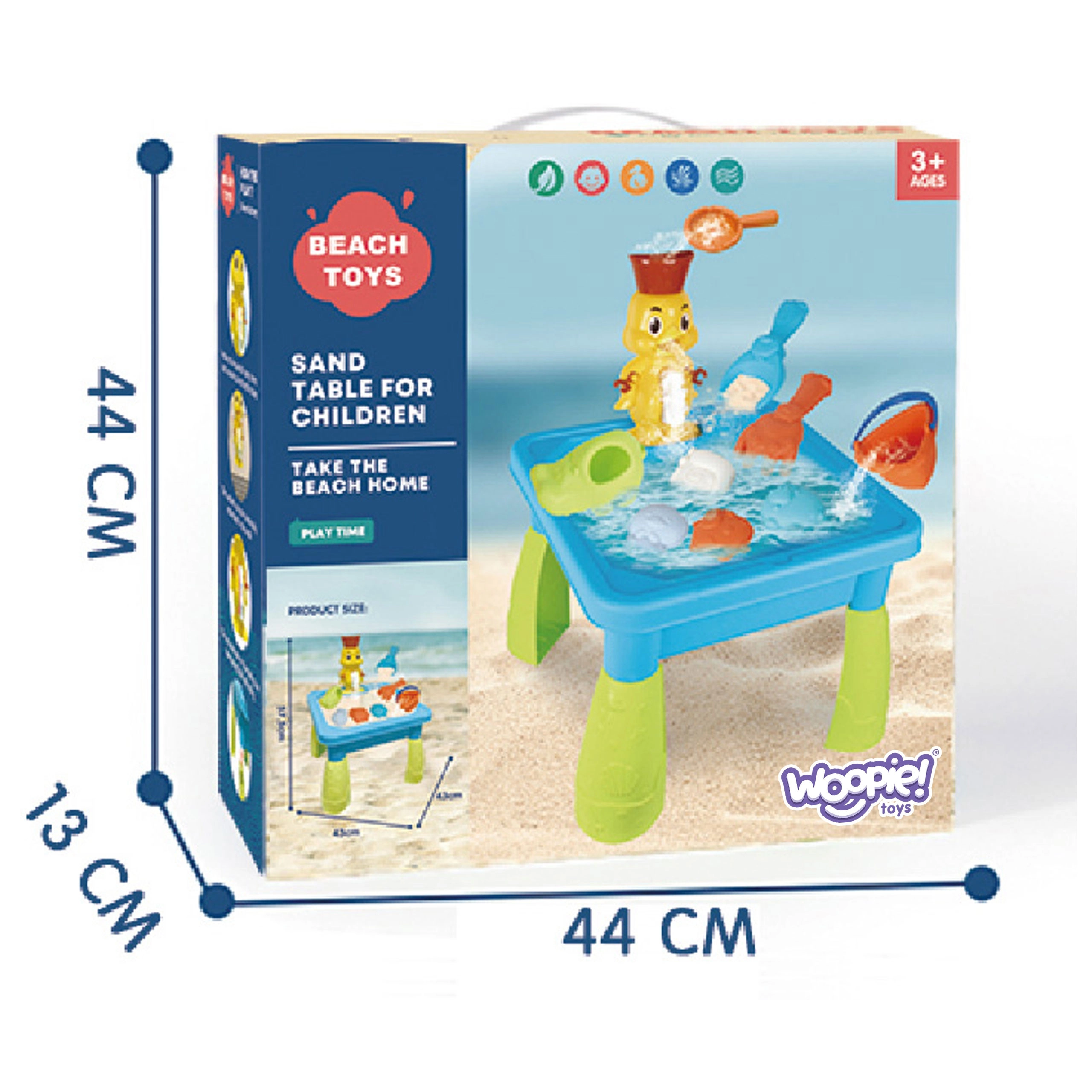Zábavný detský stolík 2v1 na hru s vodou aj pieskom od značky WOOPIE prináša hodiny zmyslovej zábavy. Súčasťou je roztomilé káčatko s vodným kolotočom a efektom vodopádu, ktoré možno vďaka prísavkám pripevniť do vane či na stenu. Set obsahuje 9–10 doplnkov vrátane vedierka, lopatiek, hrabličiek a formičiek. Ideálne na hranie doma aj vonku, jednoduché skladanie a montáž, vhodné od 3 rokov.