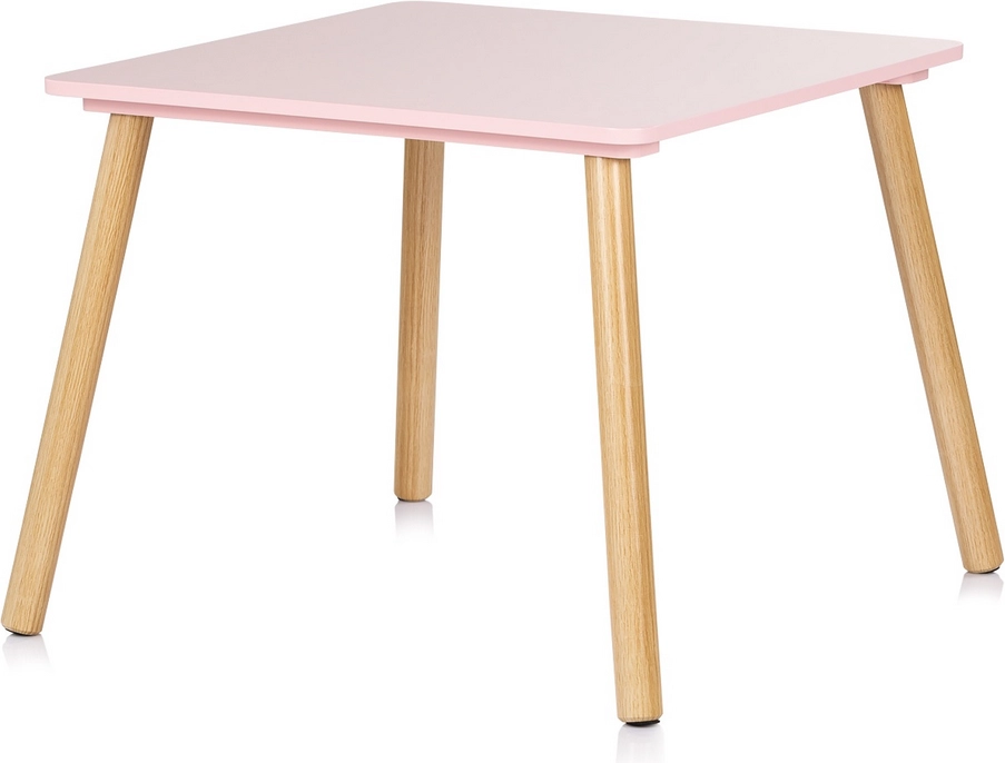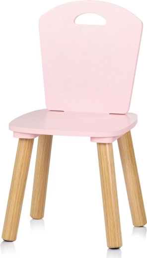Štýlová a bezpečná sada do detskej izby: detský stôl a dve stoličky v jemnej ružovej farbe s prírodnými drevenými nohami. Zaoblené hrany pre maximálnu bezpečnosť, pevná konštrukcia z kvalitného MDF a ergonomické rozmery pre pohodlné hranie, tvorenie aj prvé učenie.