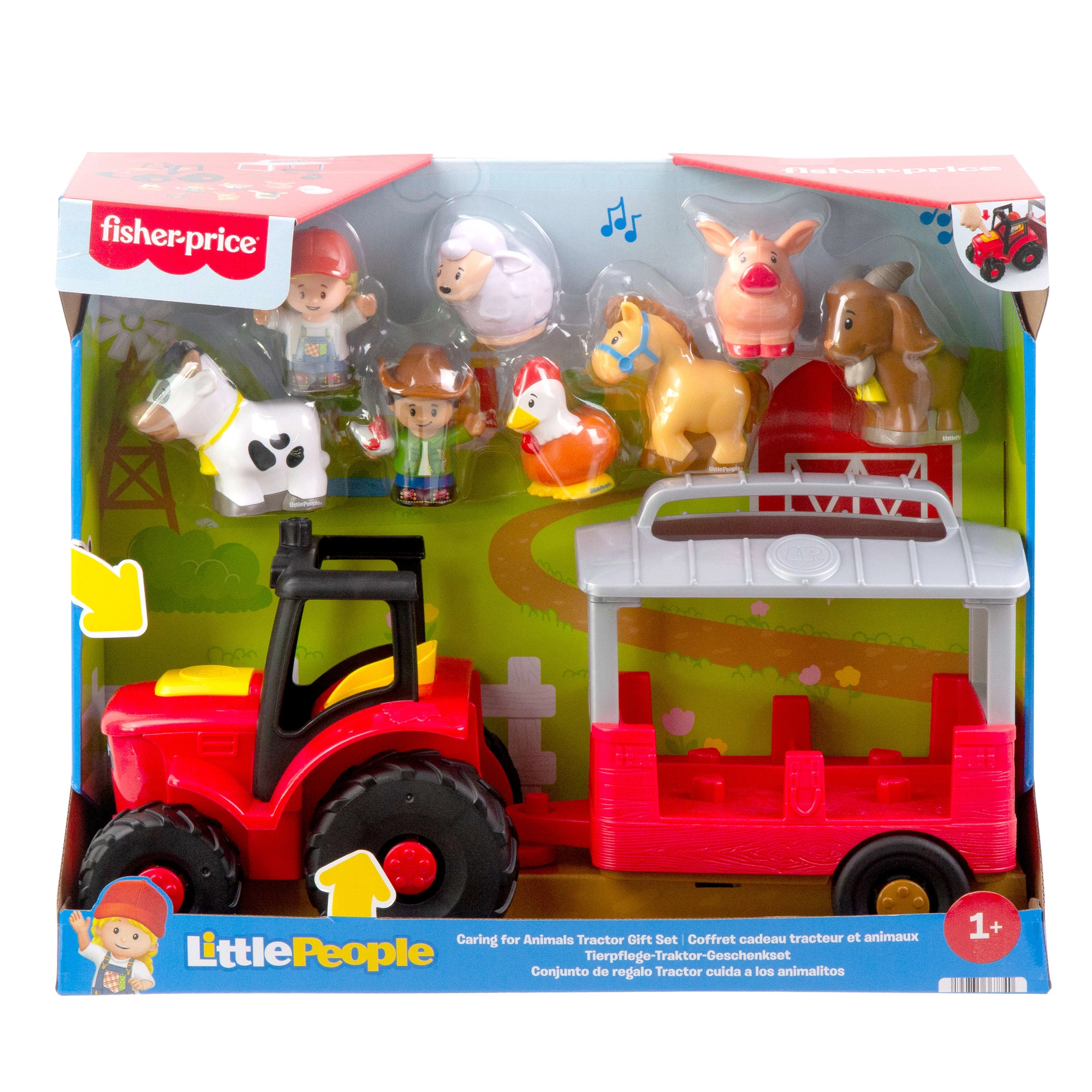Súčasťou setu sú 2 figúrky farmárov a 6 zvieratiek (prasiatko, ovečka, koník, kravička, sliepočka a kozička). Príves pojme až 4 figúrky a ľahko sa odpája, takže deti môžu jednoducho striedať scénky, prevážať zvieratká a tvoriť vlastné príbehy. Všetky diely majú ideálnu veľkosť pre malé detské ruky a sú navrhnuté na bezpečnú hru od prvých krôčikov.