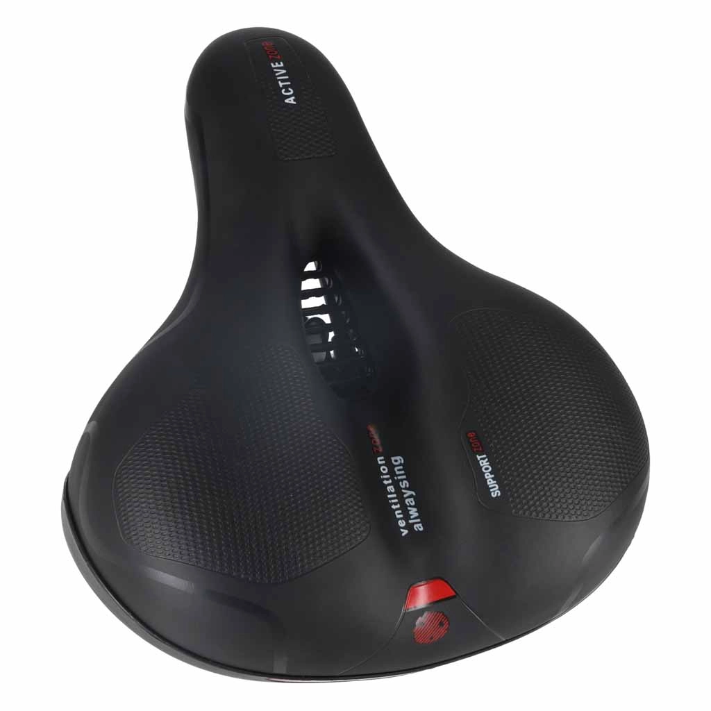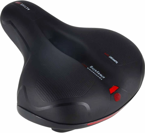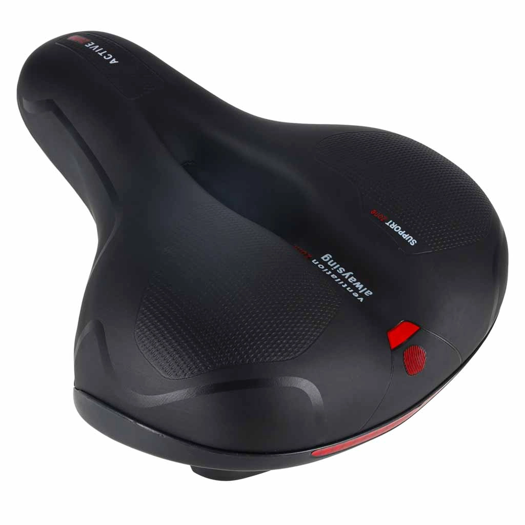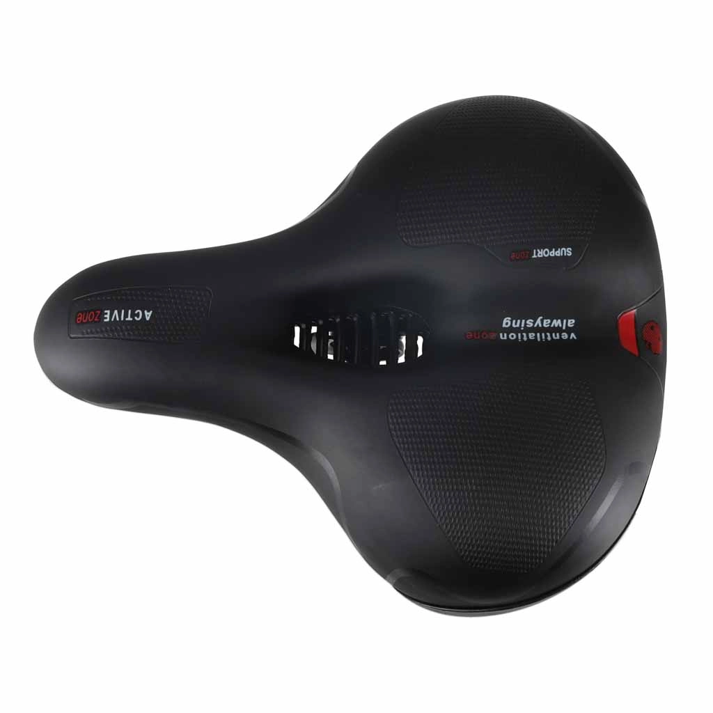 Pohodlné cyklistické sedlo pre mestskú aj trekingovú jazdu ponúka široký ergonomický tvar, elastickú penovú výplň a dvojitú pružinovú amortizáciu pre hladkú jazdu bez otlakov. Vďaka centrálnemu ventilačnému kanálu zostáva sedlo vzdušné, vodoodolný povrch z PU kože odolá dažďu a integrovaná zadná odrazka zvyšuje viditeľnosť po zotmení.