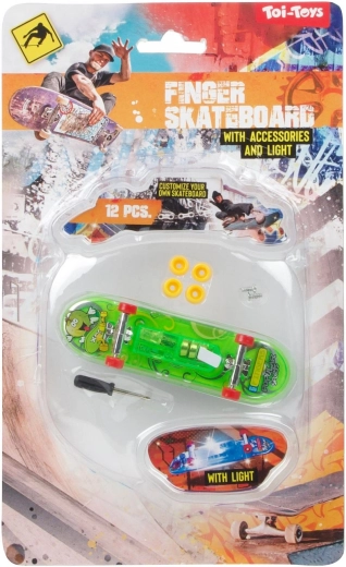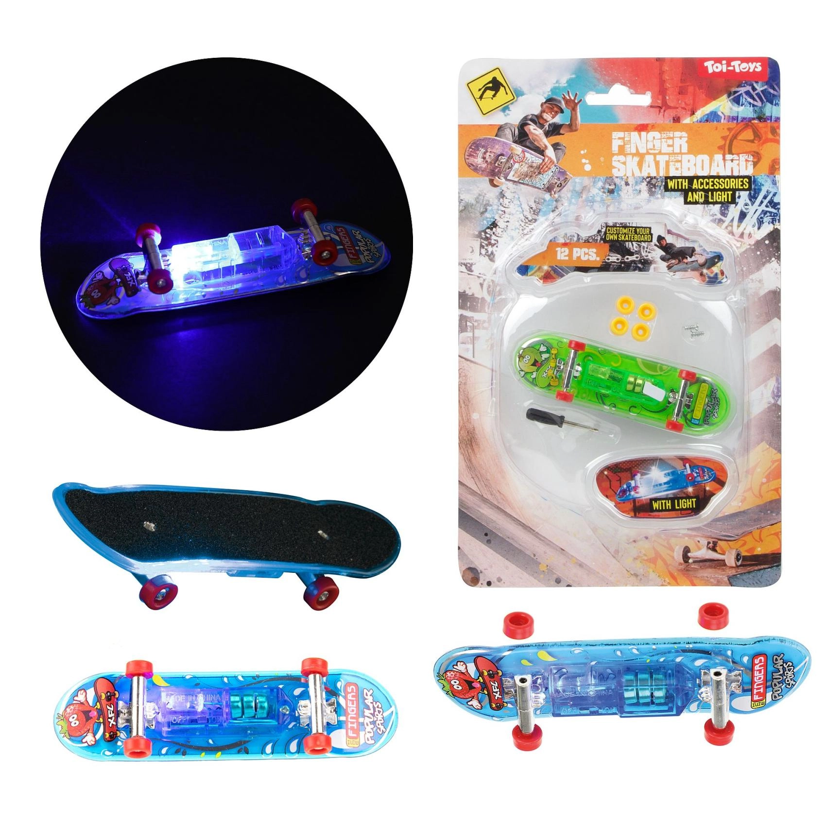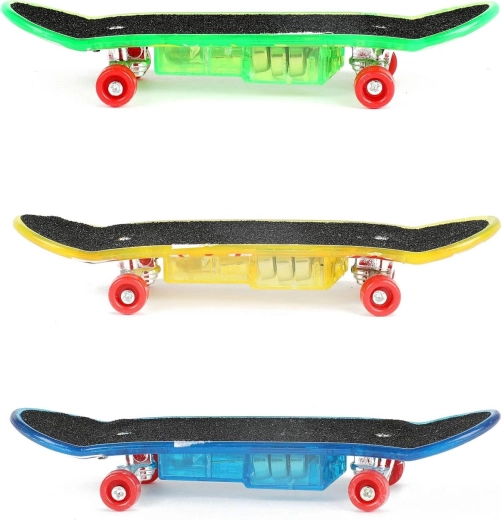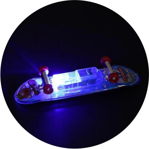 Zábavný prstový skateboard s dĺžkou 9,5 cm na batérie s integrovaným LED osvetlením pre efektnú jazdu aj triky. Kompaktné rozmery, odolné prevedenie a svietiace efekty potešia deti aj začínajúcich nadšencov fingerboardingu. K dispozícii v 3 výrazných farbách s priehľadným šasi, kovovými truckmi a plynulo sa otáčajúcimi kolieskami.