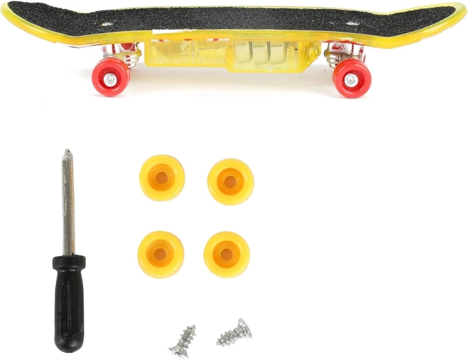 Tento prstový skateboard kombinuje atraktívny dizajn s praktickými funkciami. Priesvitná plastová doska s grip povrchom zabezpečuje stabilitu prstov, zatiaľ čo červené kolieska a kovové trucky prinášajú hladkú jazdu. Integrované LED svetlo dodáva trikom efekt a zábavu aj pri slabšom osvetlení.