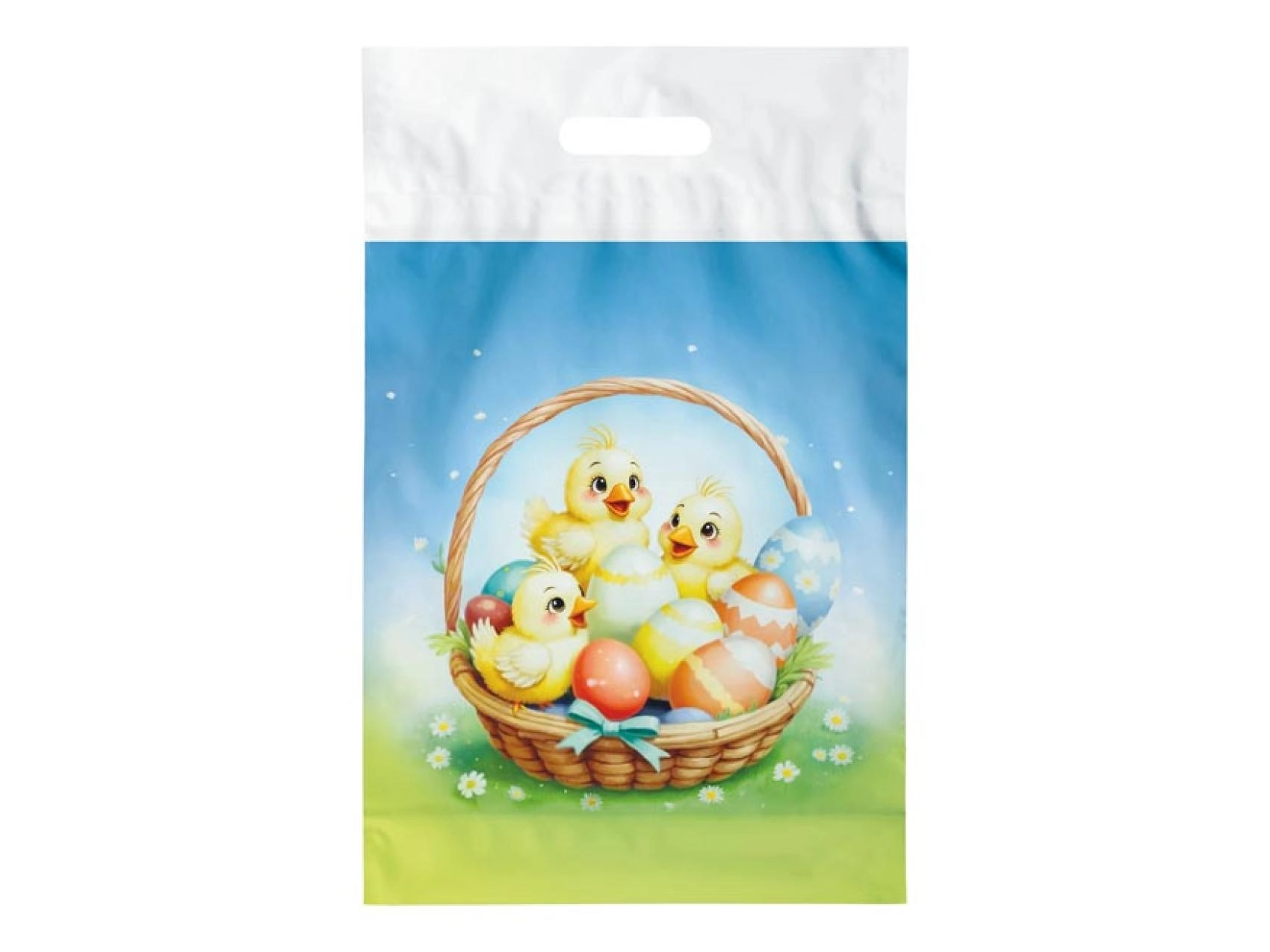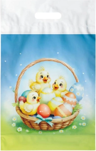Praktická veľkonočná igelitová taška vo veľkosti L s jarným motívom je ideálna na balenie darčekov, korbáčov aj dekorácií. Vďaka plastovému uchu sa pohodlne nosí a jej veselá potlač skvele doladí každú veľkonočnú nádielku. Je vyrobená z ľahkého, ale pevného materiálu vhodného na opakované použitie.