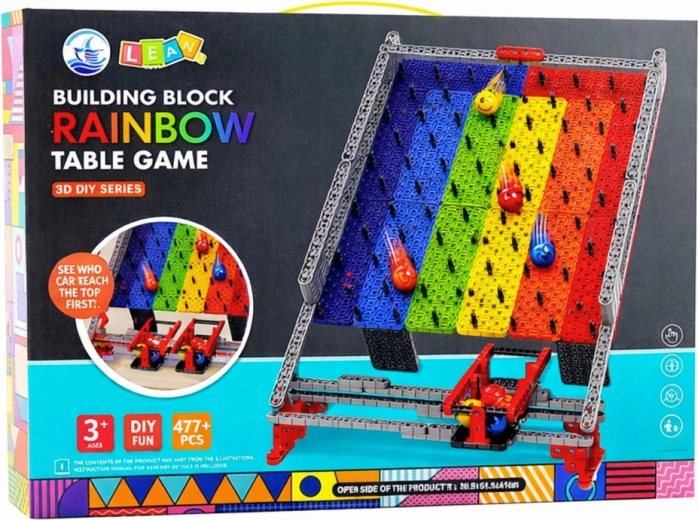 Táto rozšírená sada s 477 dielmi umožňuje postaviť stabilnú a farebnú konštrukciu s kolíkmi, zarážkami a naklápacím stojanom. Guľôčky sa po dúhovej ploche rozbiehajú rôznymi smermi a dieťa ich chytá do posuvného košíčka. Každá jazda je iná – prekážky menia dráhu a podporujú sústredenie aj rýchle reakcie.