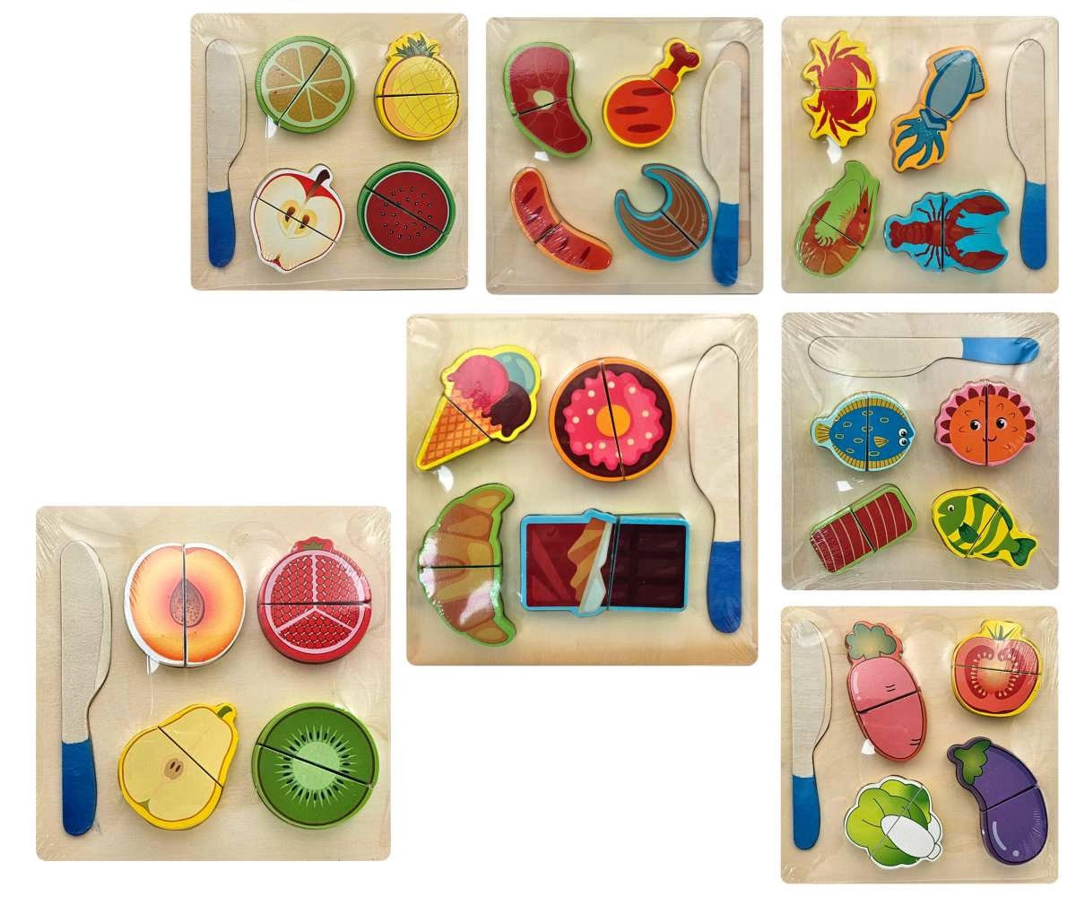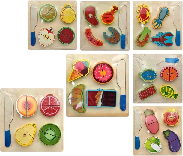 Sada je dostupná v niekoľkých motívoch, napríklad ovocie, zelenina či pečivo. Každý kus je vyrobený z odolného dreva s hladkými hranami pre bezpečnú hru. Cena platí za jeden kus/variant – ideálne na postupné rozširovanie detskej zbierky potravín.