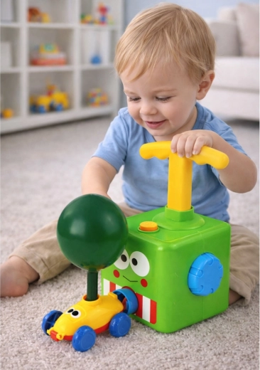 Sada balónikových autíčok so stanicou v tvare žaby učí deti, ako stlačený vzduch dokáže uviesť vozidlo do pohybu. Jednoducho nasadíte balónik, niekoľkokrát zapumpujete a autíčko vyrazí vpred – bez batérií, iba na silu vzduchu.
