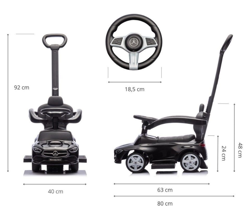 Miniatúrny MERCEDES C‑Class zaujme precíznymi detailmi – prednou maskou, svetlami a emblémami, vďaka ktorým sa deti cítia ako v naozajstnom aute. Odrážadlo kombinuje komfort, stabilitu a funkčnosť: mäkké sedadlo s opierkou, ochranné zábrany a protišmykové stúpačky zaistia pokojnú jazdu, zatiaľ čo rodičia môžu smer a tempo bezpečne korigovať pomocou vysokej rukoväti.