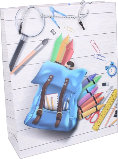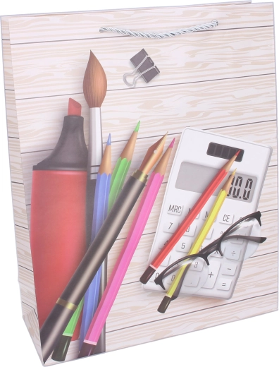 Taška je vyrobená z odolného papiera a má pevne ukotvené šnúrkové ušká, ktoré zaisťujú bezpečné prenášanie. Bočné sklady dodávajú dostatočnú kapacitu a stabilitu, takže sa obsah ľahko vkladá aj vyberá. K dispozícii sú 4 rôzne potlače – hodiny, slúchadlá a zošity, kalkulačka s písacími potrebami alebo mix školských pomôcok – pre radostné a štýlové odovzdanie darčeka.