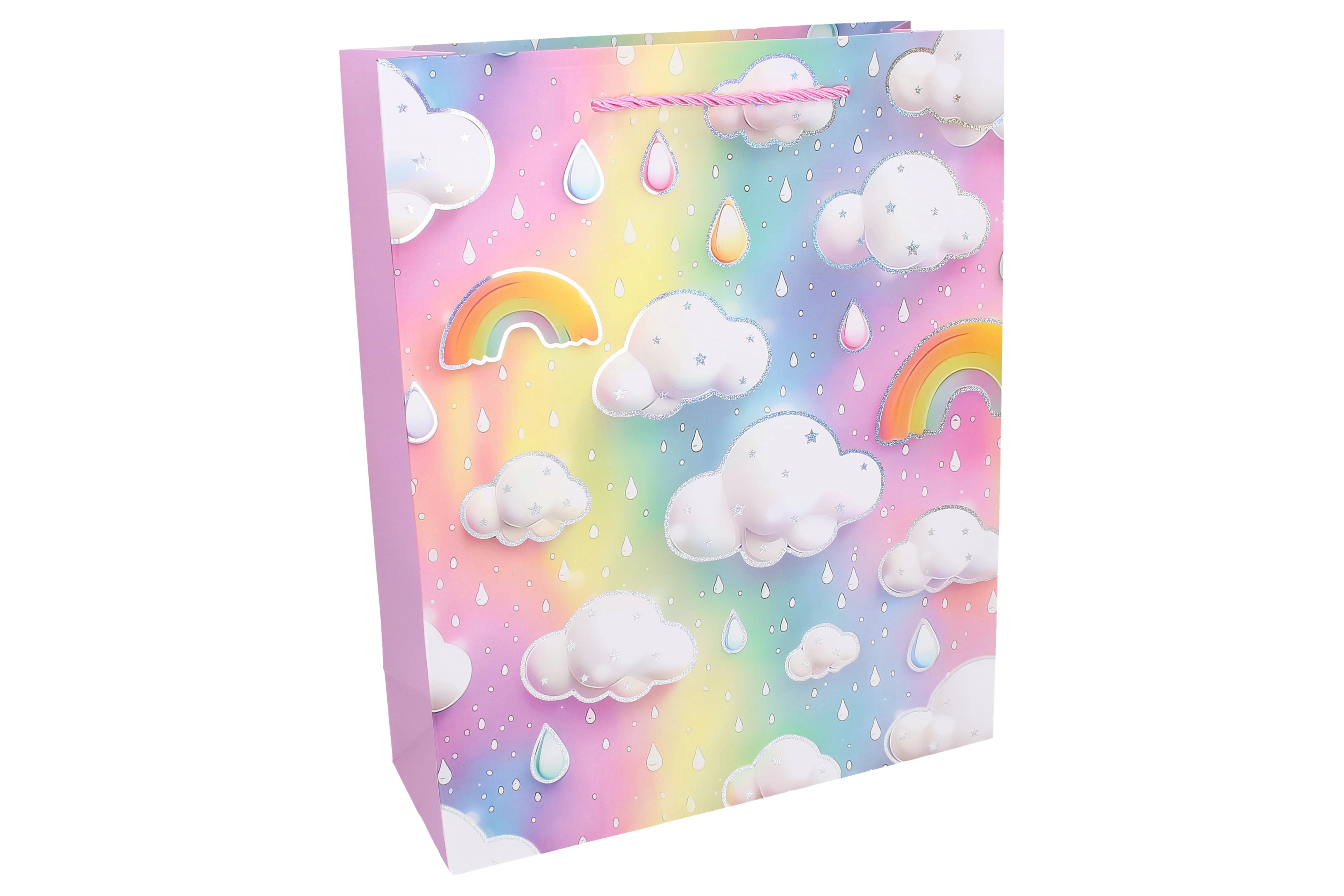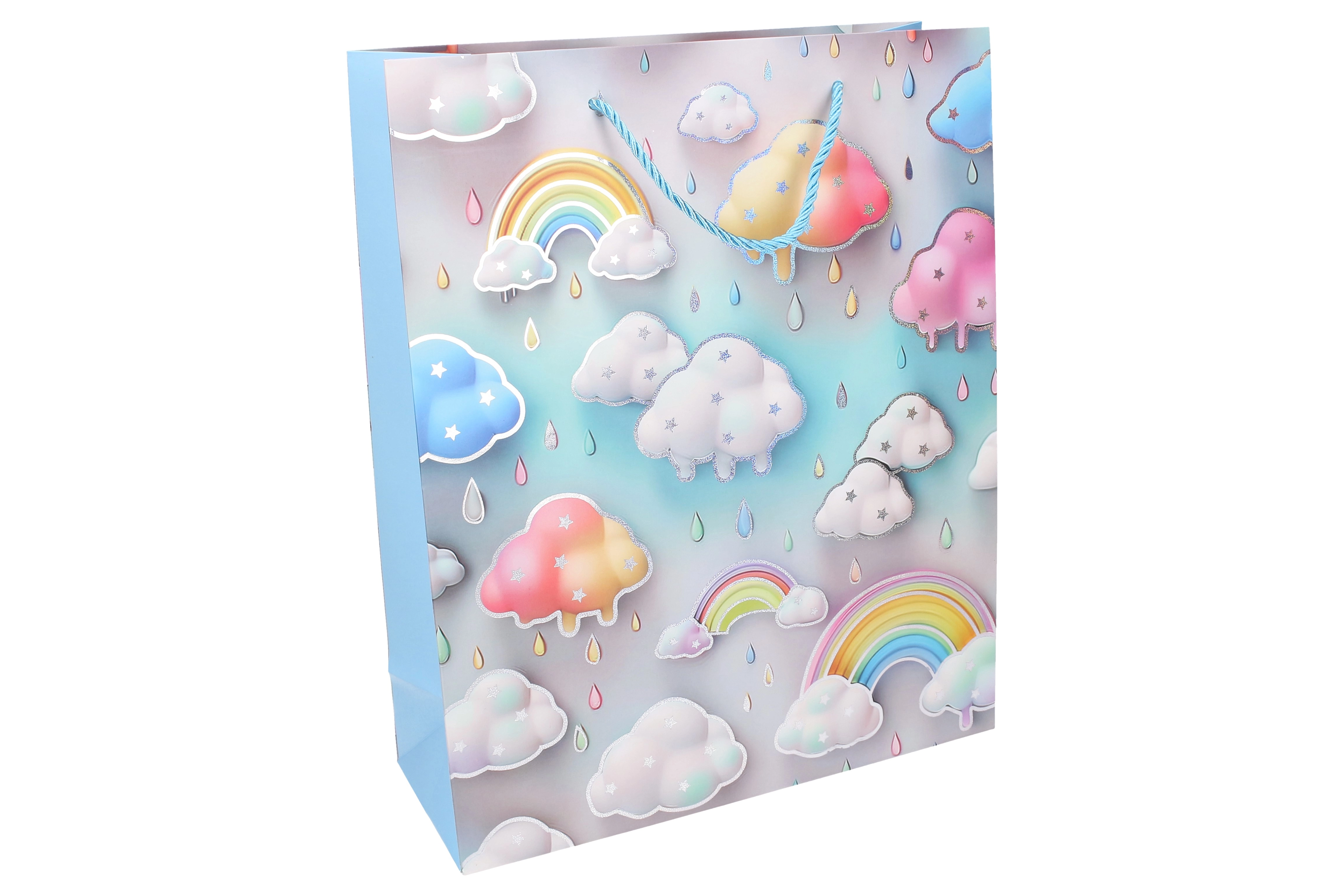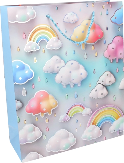 Pastelová dúha, obláčiky a kvapky vytvárajú jemný a hravý vzhľad, ktorý poteší každé dieťa a zvýrazní váš darček.