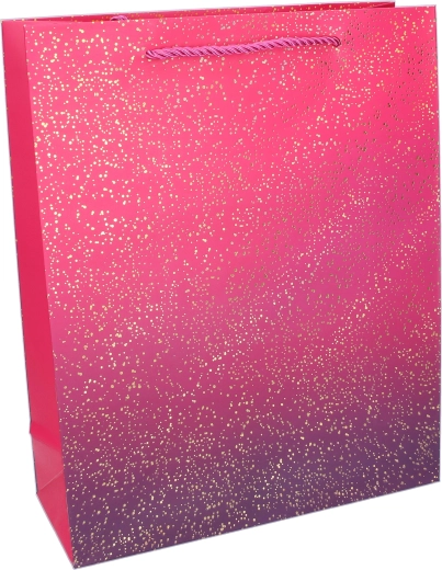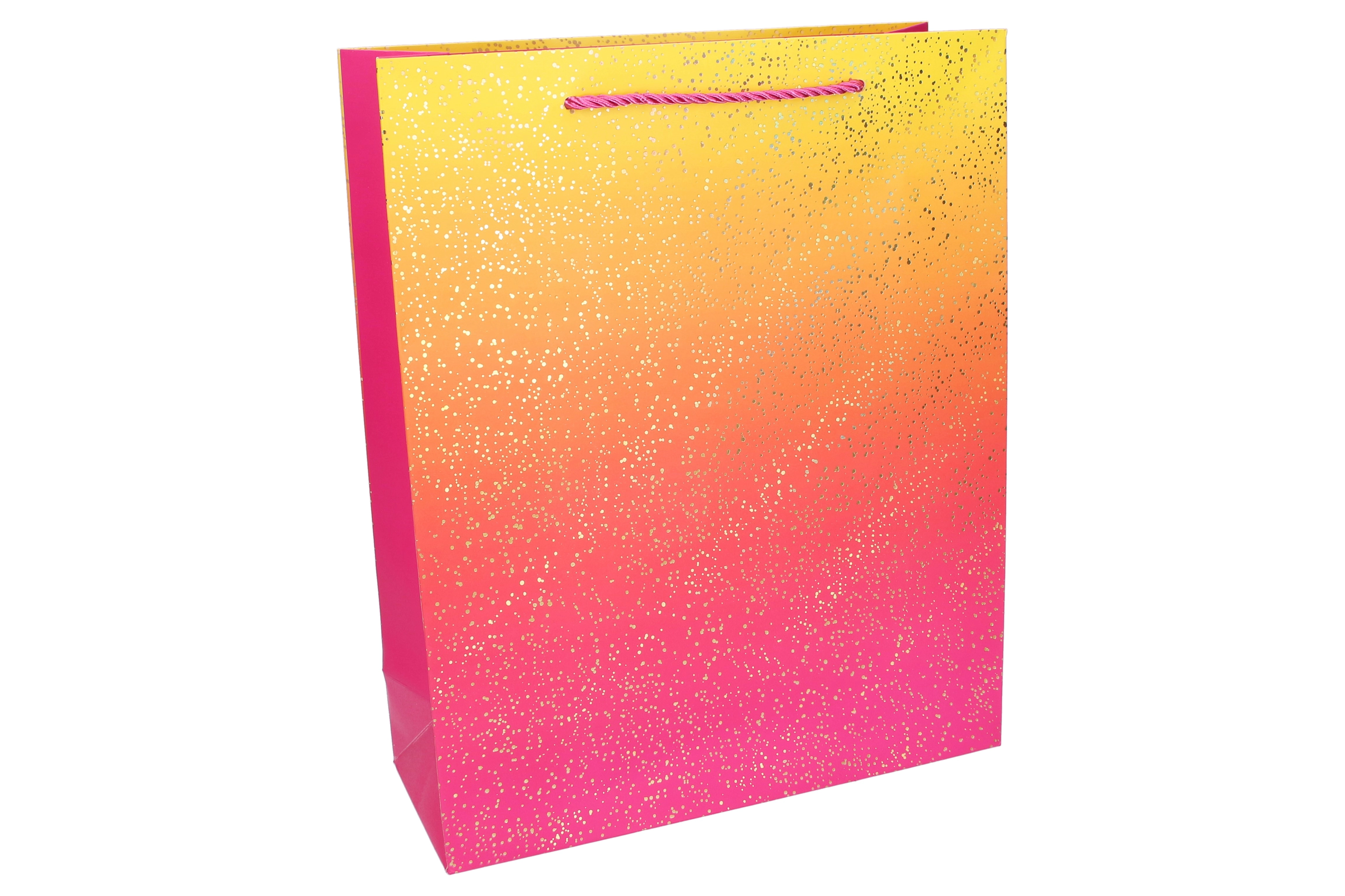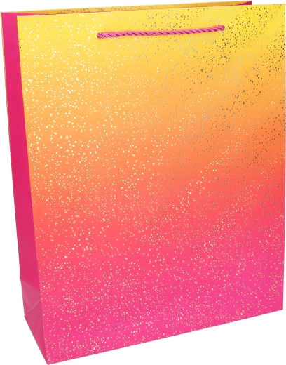Táto celoročná darčeková taška je ideálna na narodeniny, svadby, oslavy aj firemné darčeky. Lesklý papier s prechodovým efektom a jemnou zlatou potlačou „confetti“ pôsobí luxusne, zatiaľ čo pevná konštrukcia zaručuje spoľahlivé zabalenie vášho darčeka.