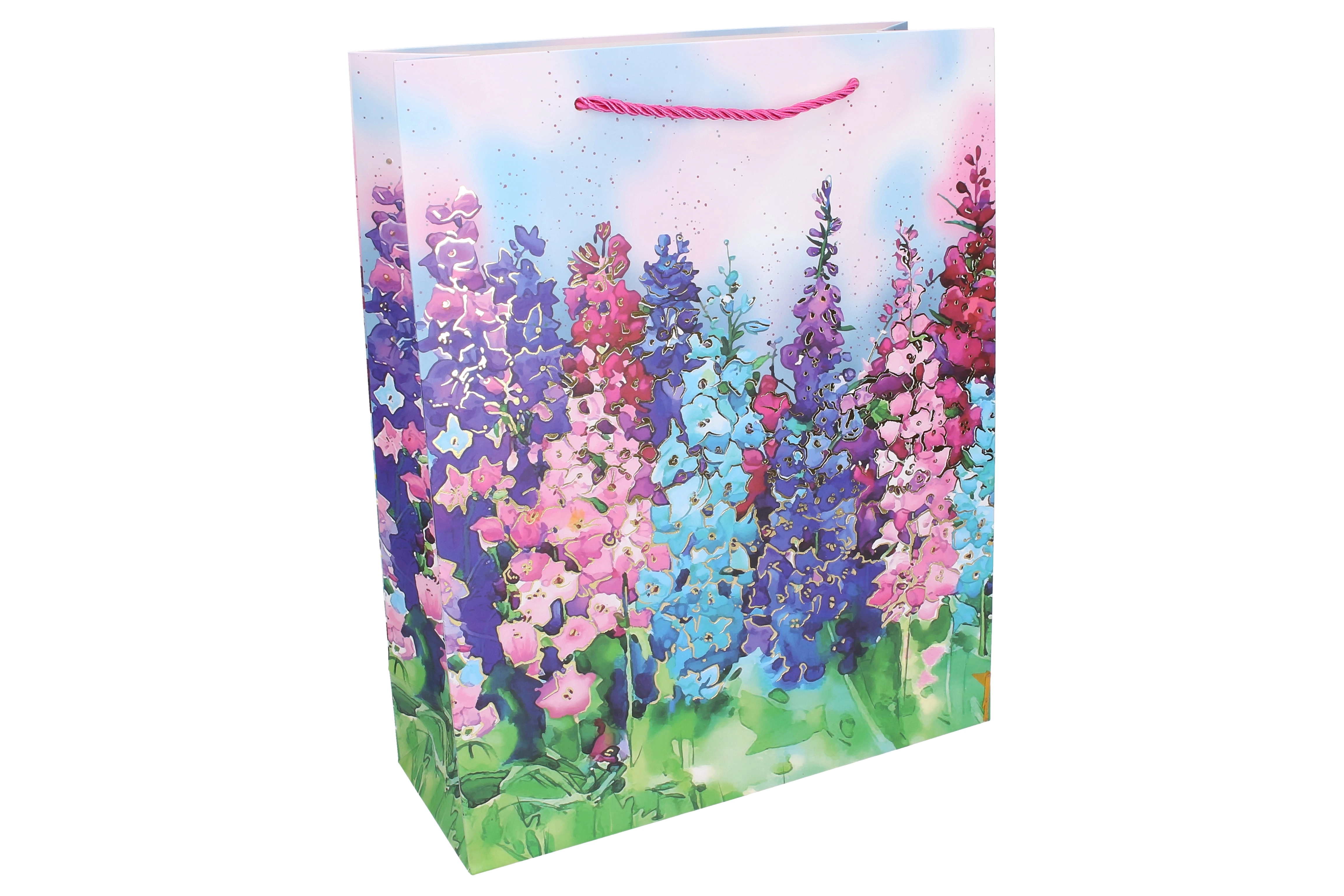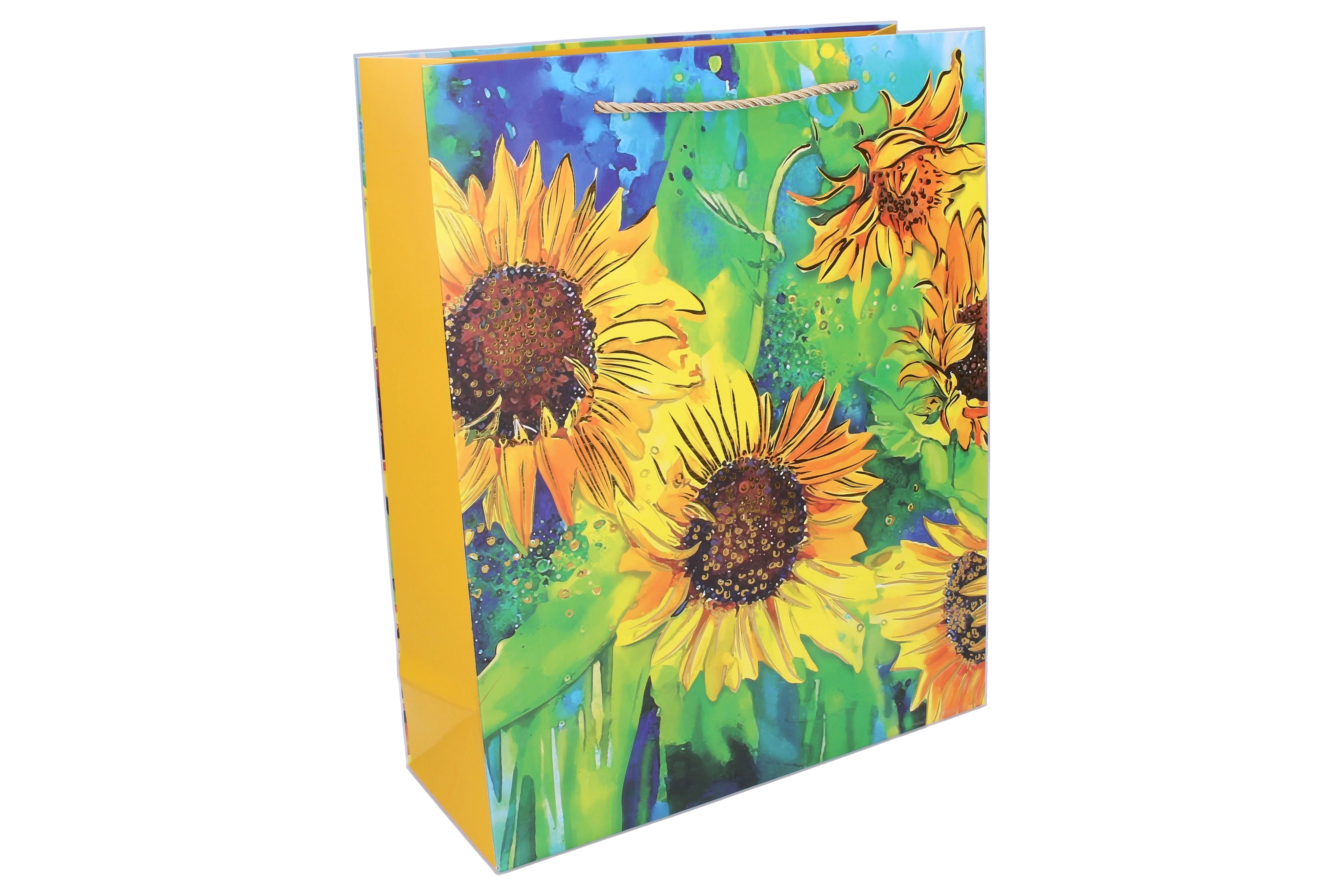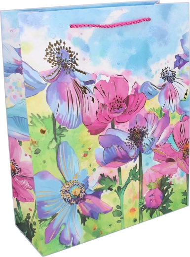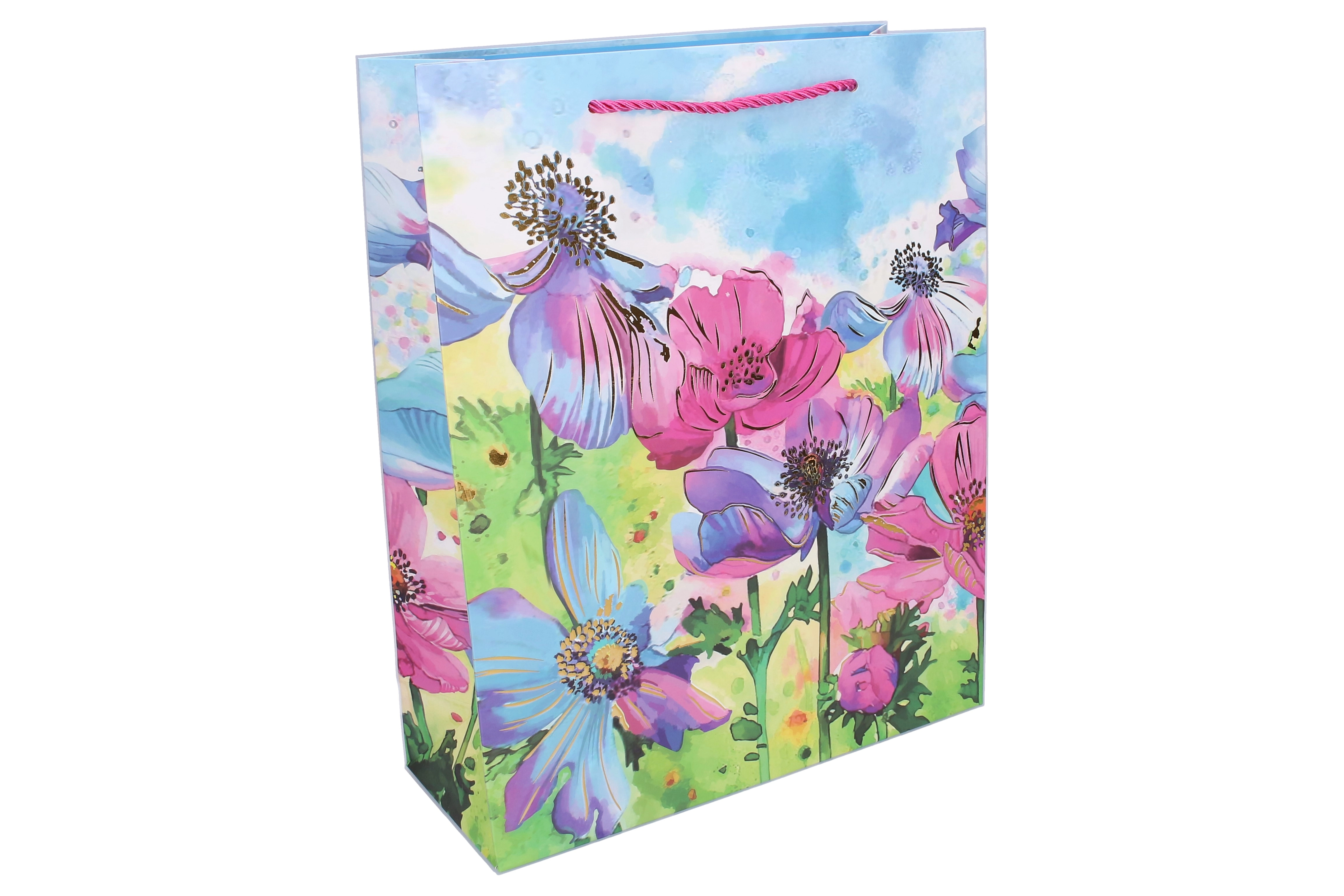 Elegantná darčeková taška veľkosti M s rozmermi 26 × 32 × 10 cm a kvetinovými motívmi je ideálna na celoročné darčekovanie. Má lesklý povrch, pevné šnúrkové ucho a odolné papierové spracovanie pre bezpečné a štýlové odovzdanie darčekov. K dispozícii sú 4 atraktívne varianty s kvetinovou potlačou.