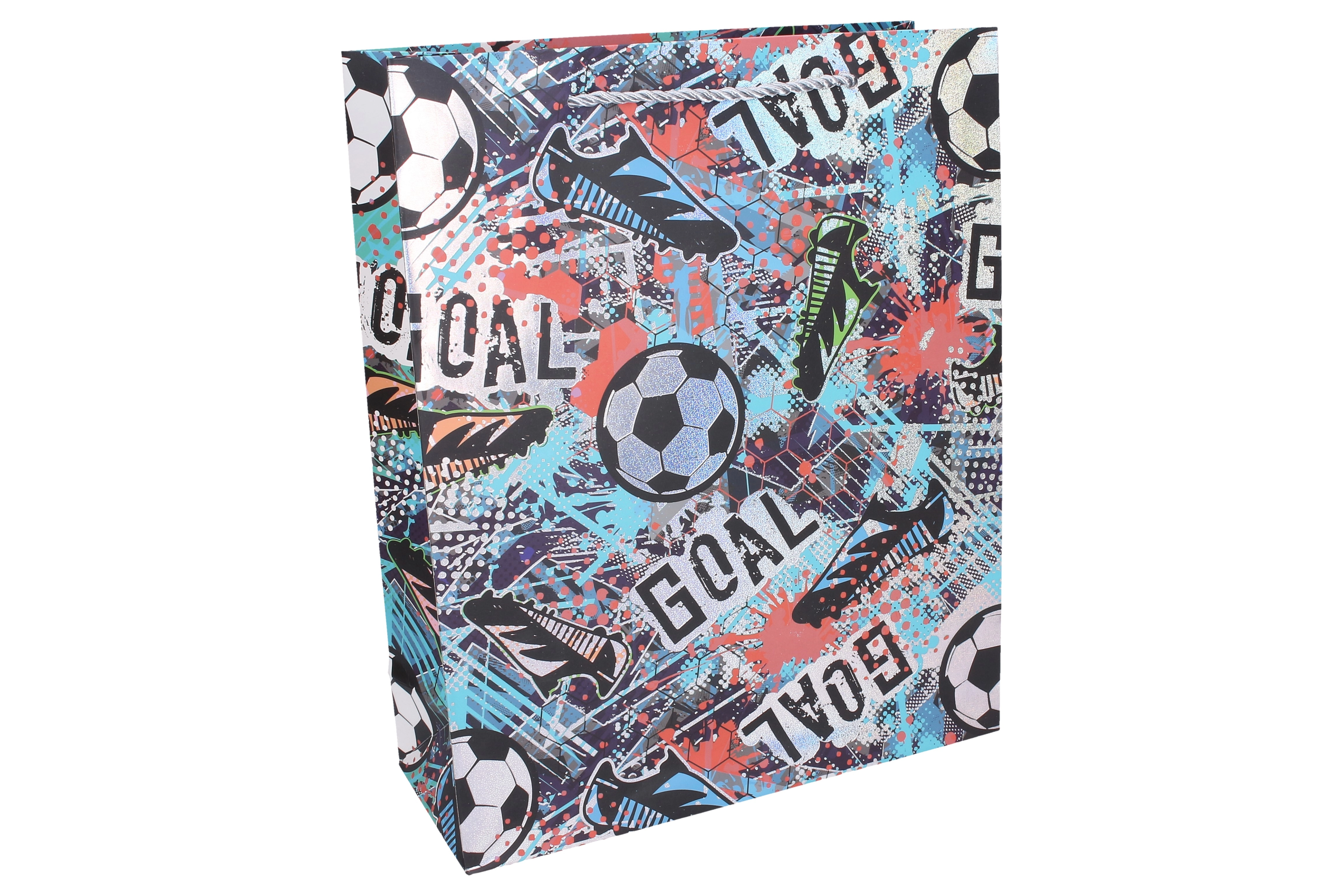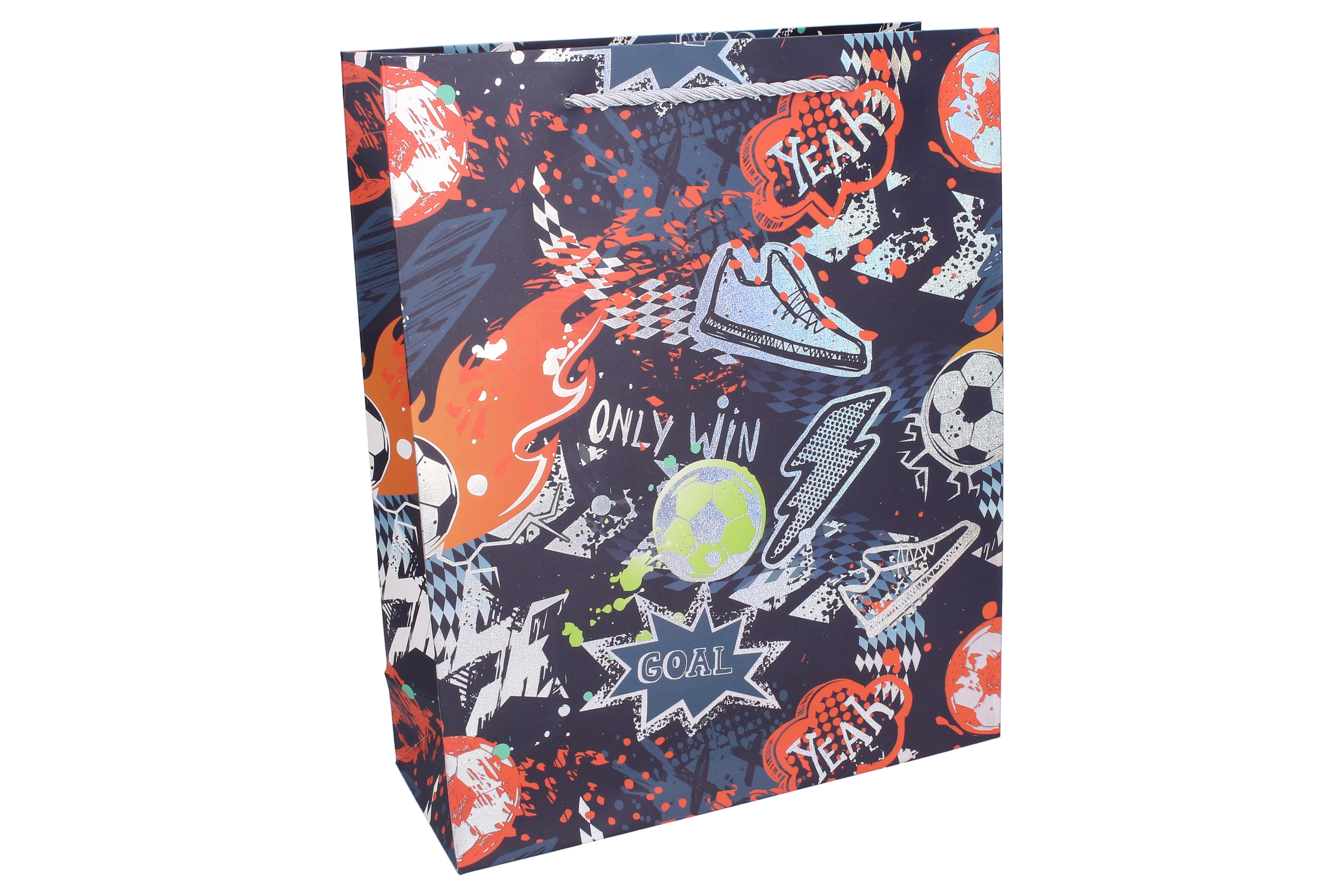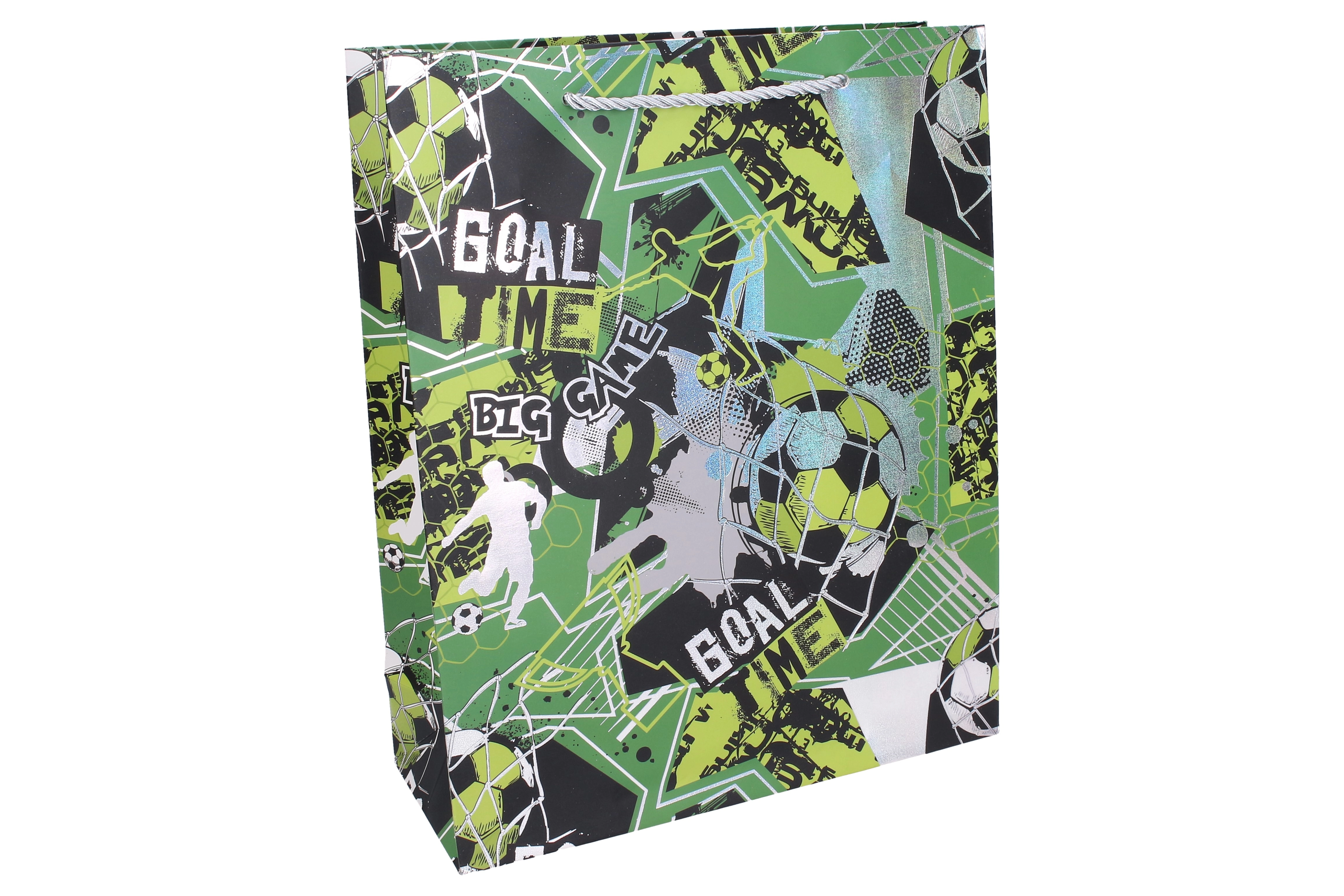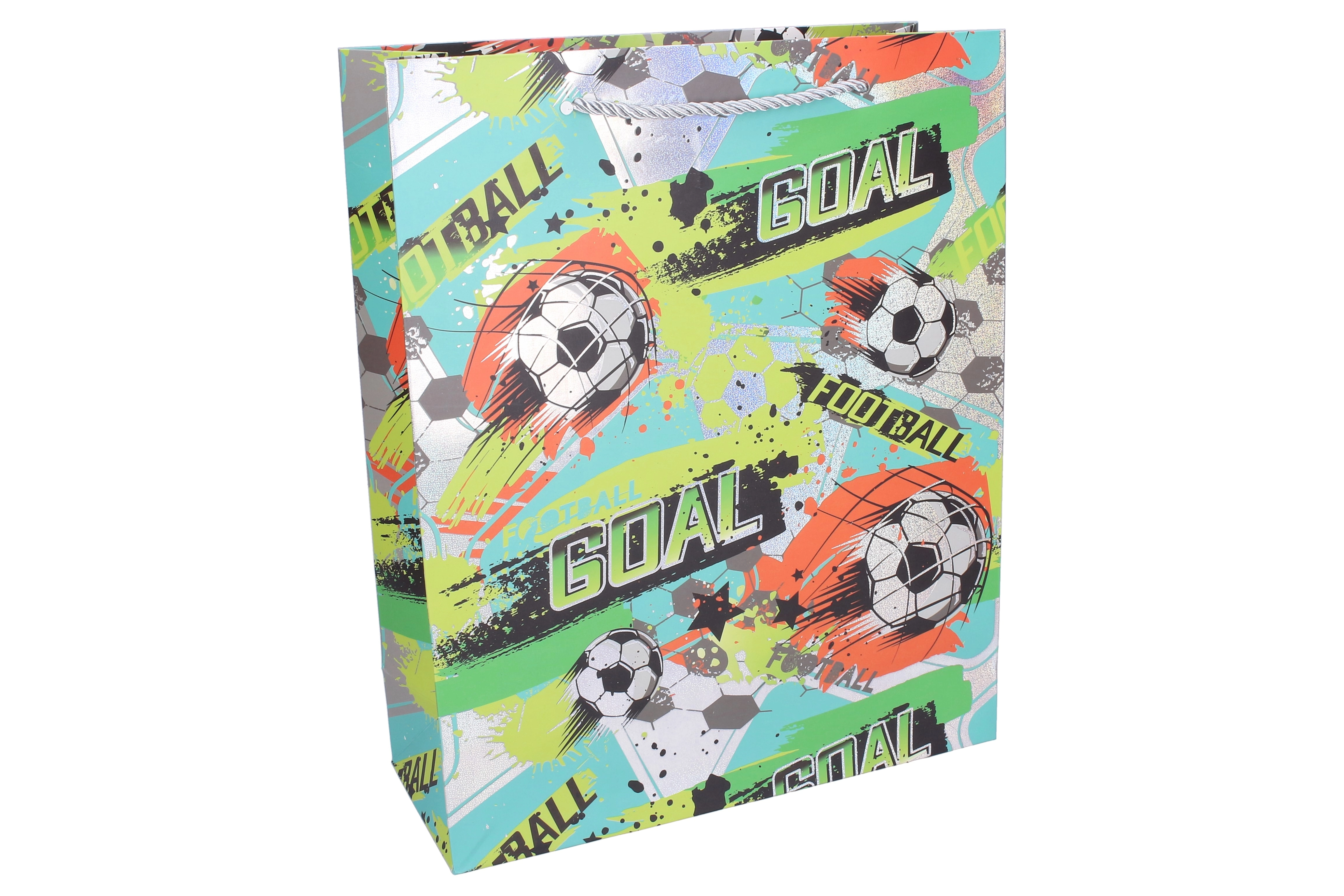 Štýlová darčeková taška vo veľkosti L s rozmermi 31 × 42 × 12 cm s atraktívnym futbalovým dizajnom poteší každého malého fanúšika. Vďaka pevnému papieru, zosilneným šnúrkovým uškám a odolnému spracovaniu bezpečne unesie hračky aj objemnejšie darčeky. K dispozícii sú 4 farebné varianty s výraznými motívmi lôpt, kopačiek a nápismi ako „GOAL“ či „TEAM“ – ideálne na narodeniny, športové oslavy aj detské párty.