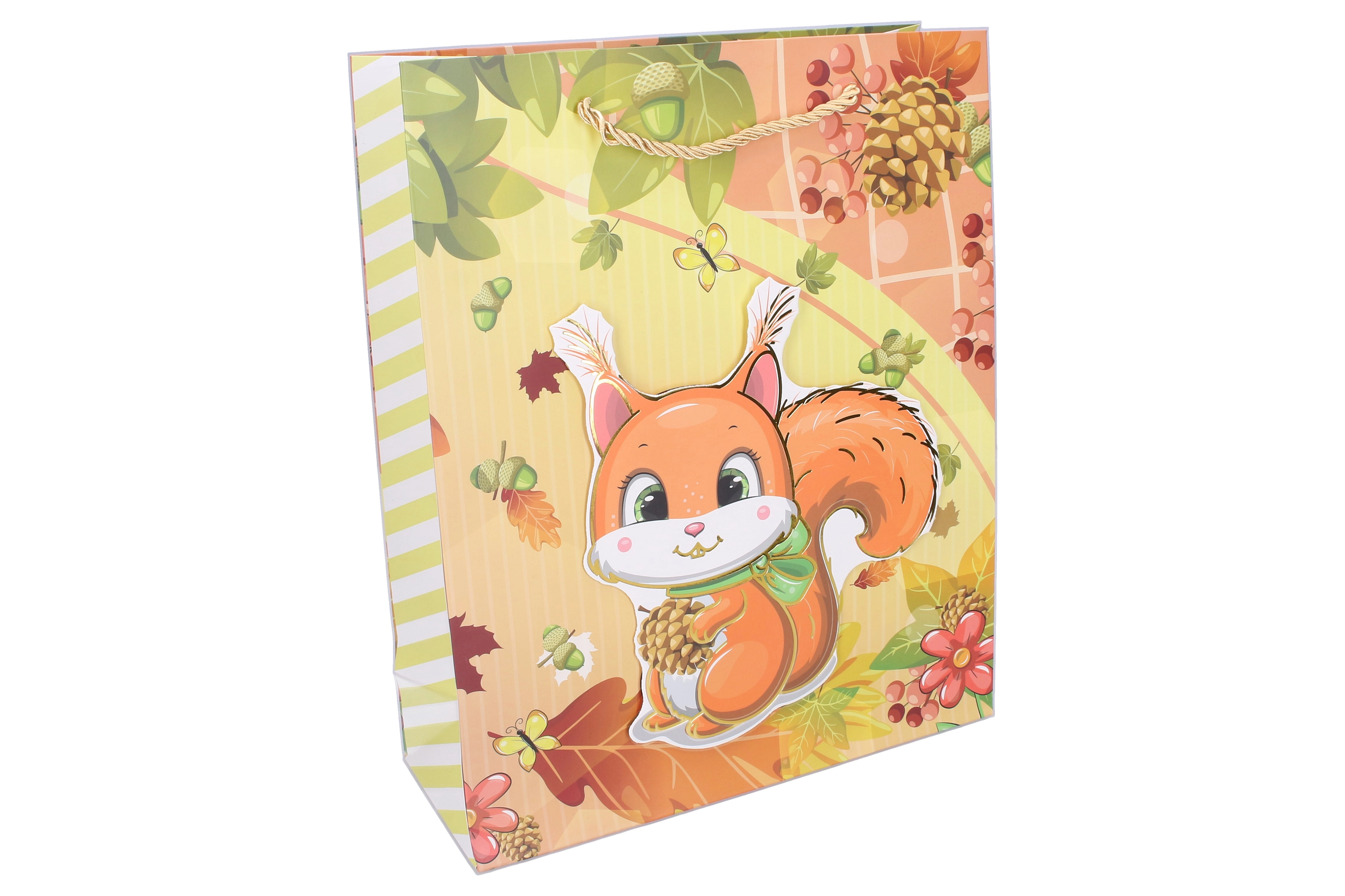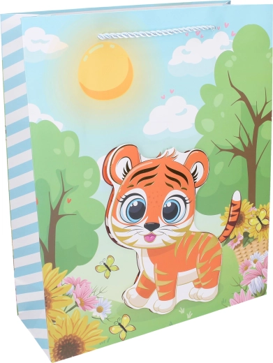 Roztomilá detská darčeková taška veľkosti L s rozmermi 30 × 41,5 × 12 cm s motívmi zvieratiek poteší pri každom odovzdávaní darčeka. Na výber sú 4 varianty – mačka, jeleň, tiger a veverička.