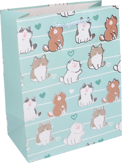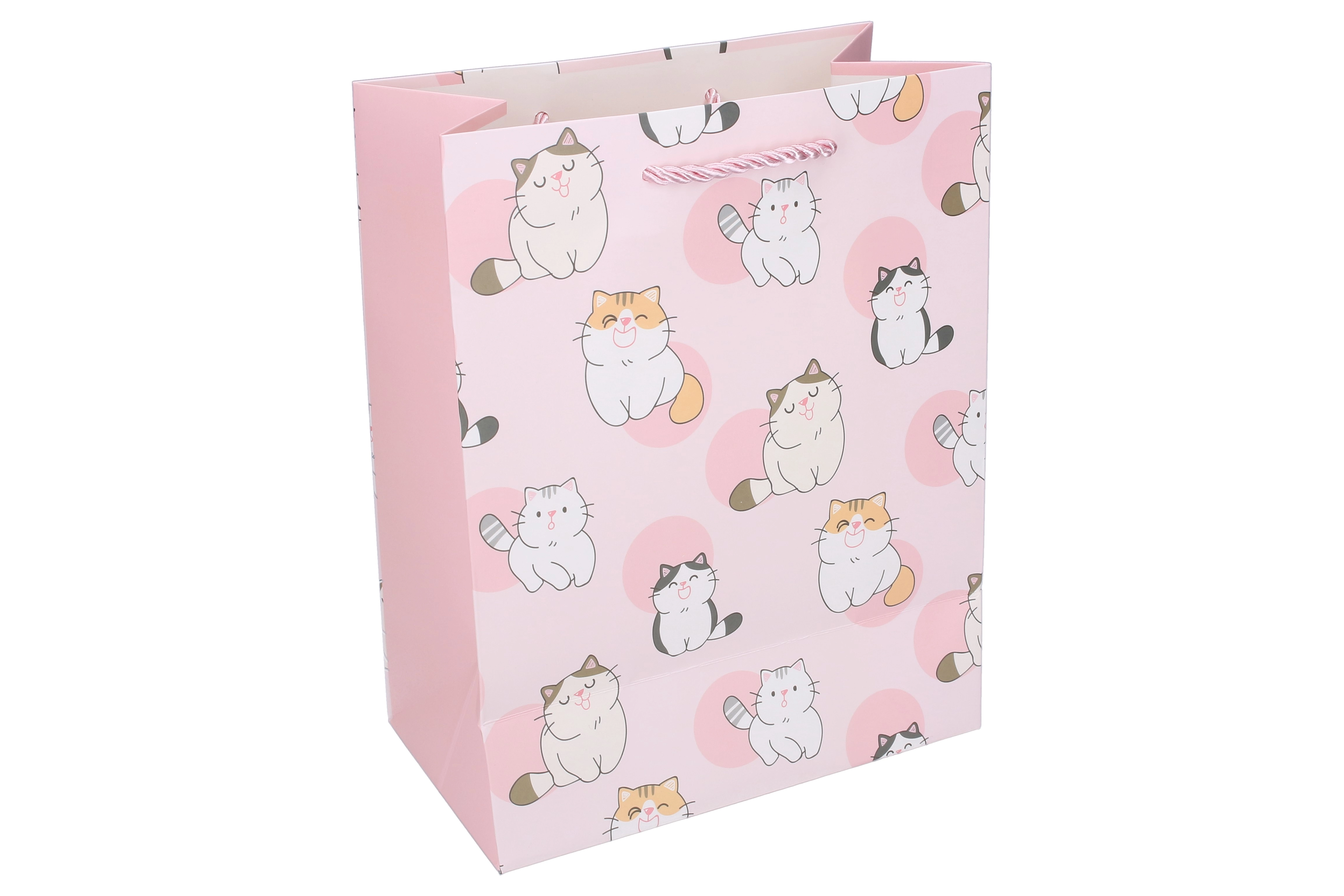 Táto darčeková papierová taška s hravými mačacími ilustráciami je ideálna na narodeniny, sviatky aj drobné prekvapenia. Rozmer L (30 × 41,5 × 12 cm) pojme knihy, hračky, oblečenie či sady drobných darčekov. Pevný papier a kvalitné skrútené povrázky zabezpečujú pohodlné a bezpečné prenášanie.