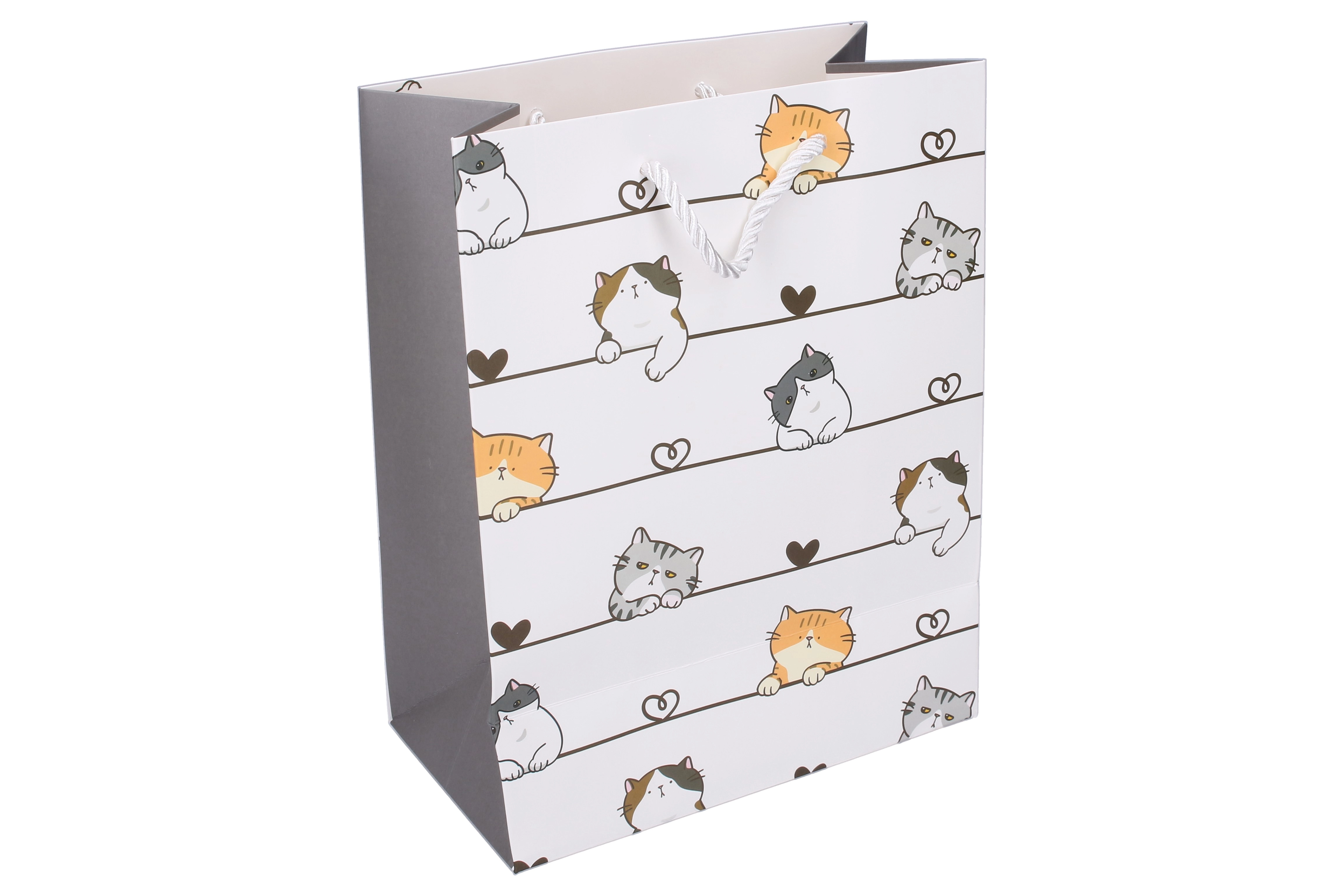 Darčeková taška s veselými mačacími ilustráciami je ideálna na balenie narodeninových aj sviatočných darčekov. Vďaka pevnej papierovej konštrukcii a spevnenému dnu spoľahlivo unesie ľahšie až stredne ťažké drobnosti, hračky či kozmetiku. Elegantné skrútené šnúrkové ušká zabezpečujú pohodlné prenášanie.