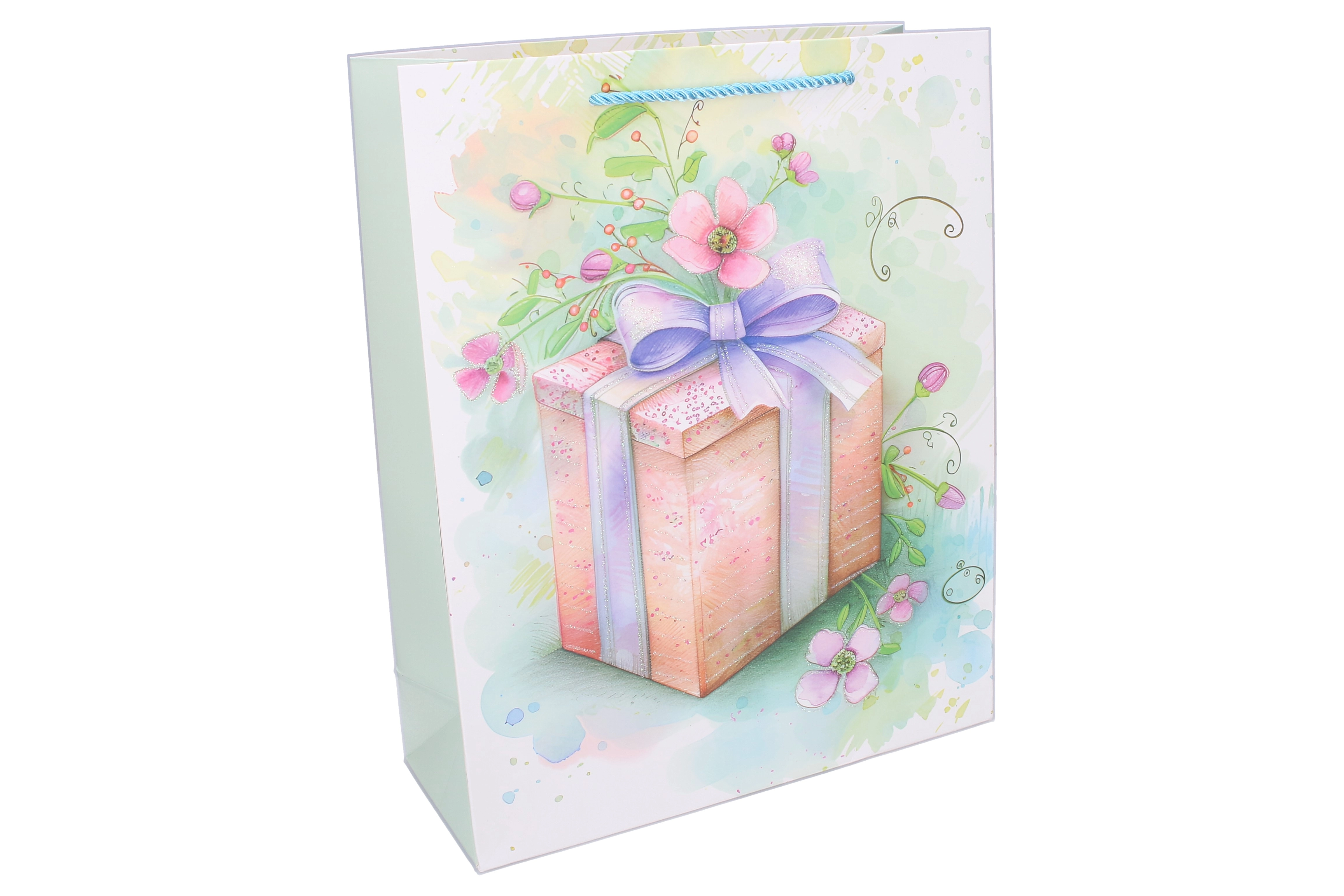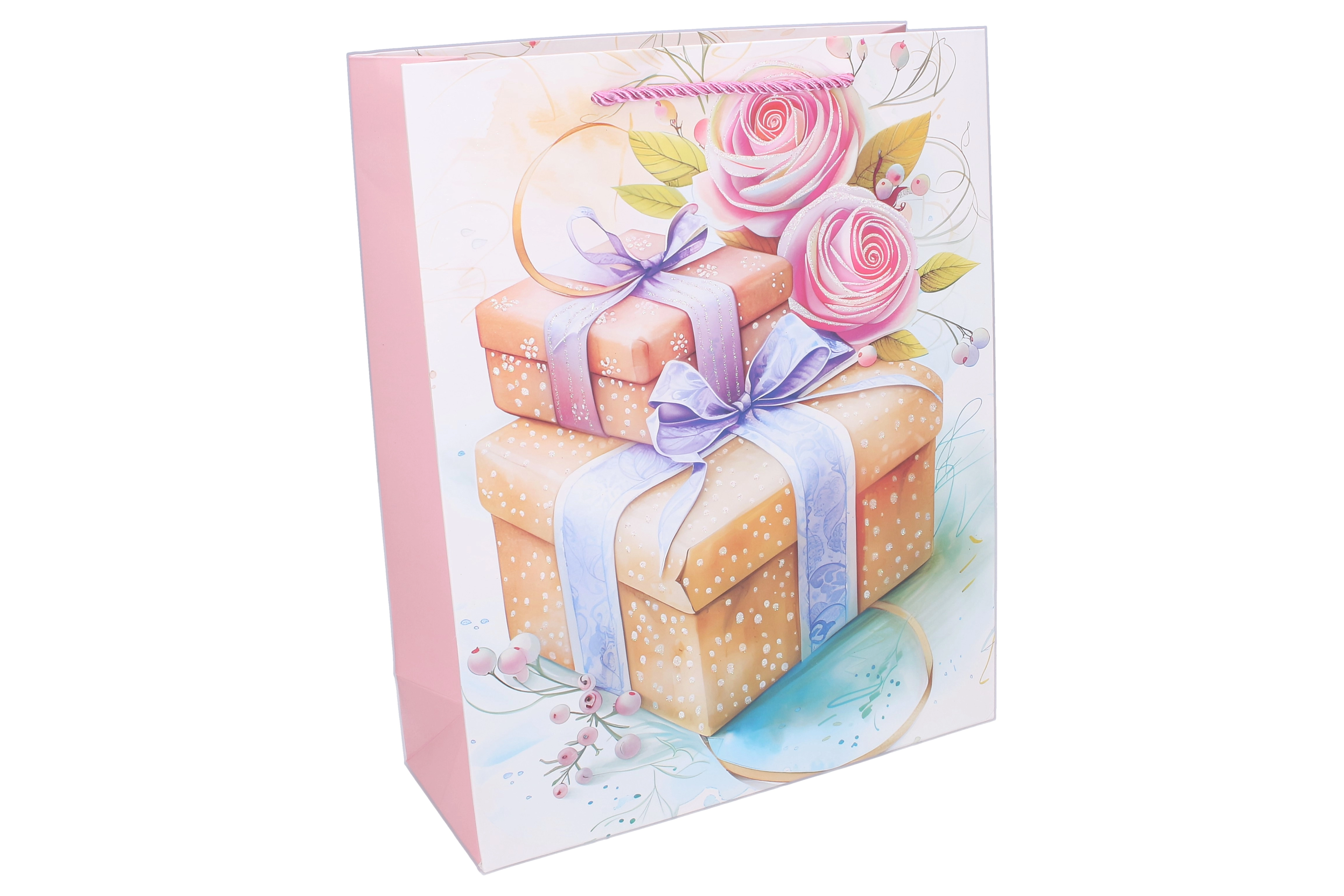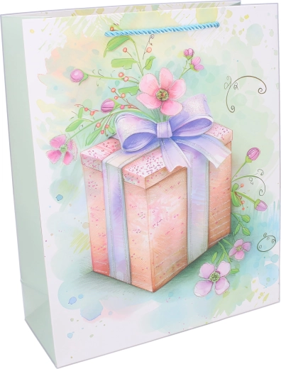 Štýlová darčeková taška vo veľkosti L s rozmermi 30 × 40 × 12 cm je ideálna na elegantné balenie darčekov počas celého roka. Ponúka pevné šnúrkové ucho, kvalitné papierové prevedenie a jemné pastelové motívy s kvetmi a darčekmi, ktoré z nej robia reprezentatívne balenie pre každú príležitosť.