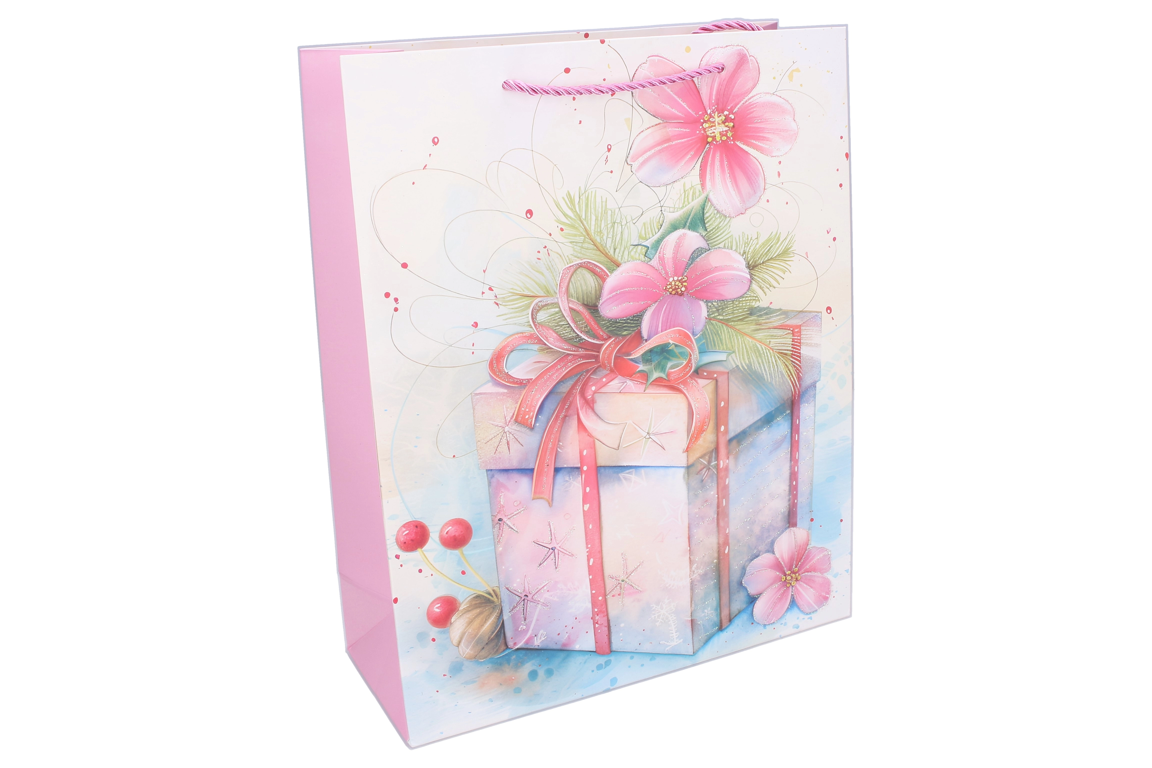 Táto elegantná darčeková taška s celoročným motívom uľahčí balenie darčekov a zároveň zaujme svojím vzhľadom. Kvalitný papierový materiál a pevné skrútené ušká zaručujú pohodlné a bezpečné prenášanie. Lesklá potlač s ilustráciami darčekov, kvetov a stúh dodá vášmu prekvapeniu slávnostný nádych.