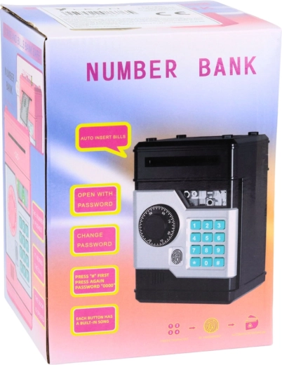 Moderná pokladnička vo vzhľade trezoru je ideálna pre deti, ktoré sa učia hospodáriť s peniazmi. Po vložení bankovky ju prístroj automaticky vtiahne, mince padajú horným otvorom. Po zadaní štvormiestneho PIN-u sa dvierka otvoria; ak zostanú otvorené, pokladnička po cca 20 s pripomenie ich zatvorenie.