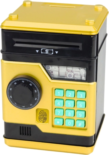 Štýlová detská pokladnička v tvare trezoru v zlatej farbe spája hru a učenie finančnej gramotnosti. Ponúka štvormiestny PIN kód, automatické vťahovanie bankoviek, slot na mince a svetelné aj zvukové efekty. Vďaka zamykaniu dvierok majú deti pocit súkromia a kontroly nad úsporami, čo ich motivuje k pravidelnému sporeniu.