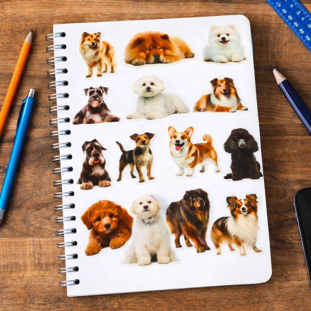Po nalepení vynikne iba motív psa – bez rušivého bieleho okraja. Ideálne na farebné zošity, obaly a kreatívne projekty.