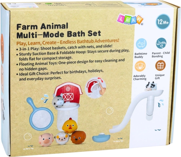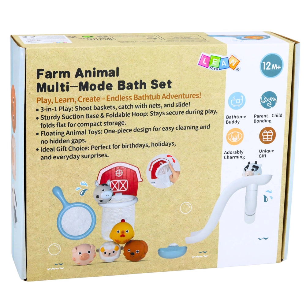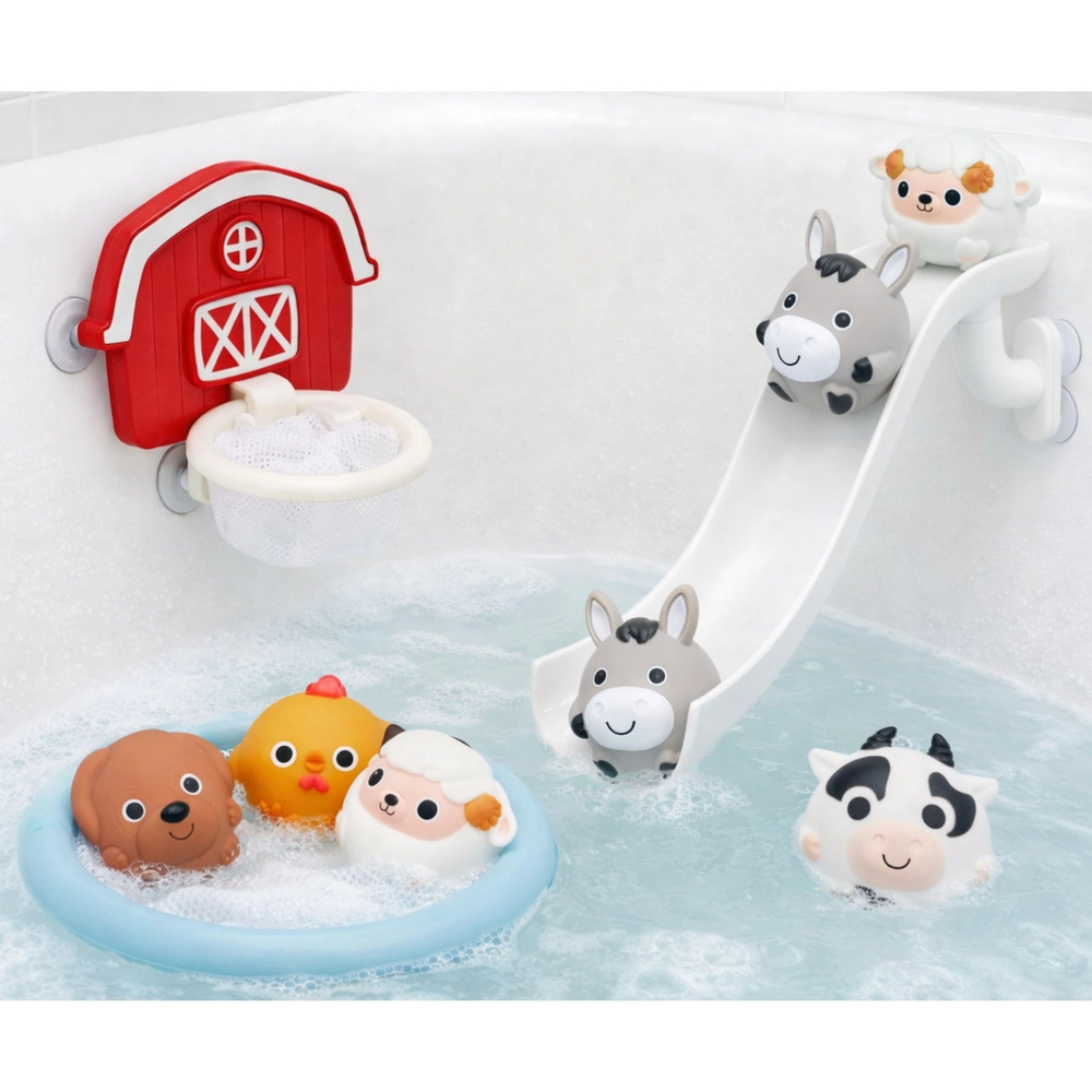 Premeňte kúpanie na zábavu so súpravou na tému farmy! Deti si užijú šmykľavku pre zvieratká, košík so sieťkou na chytanie aj striekacie a stláčacie zvieratká, ktoré plávajú na vode. Diely sa vďaka prísavkám ľahko prichytia na hladké povrchy a mäkké, bezpečné materiály sú vhodné pre malé detské rúčky.