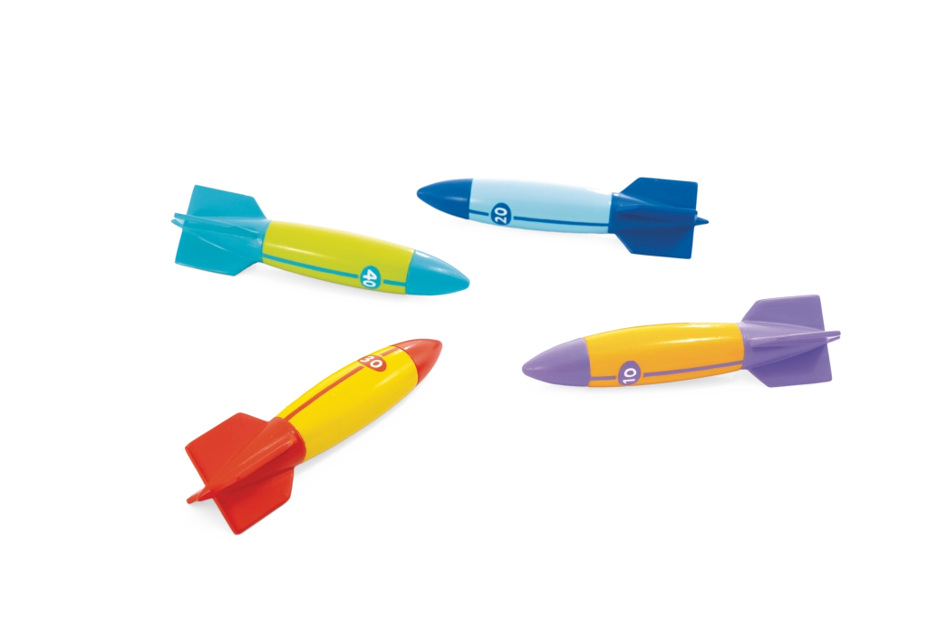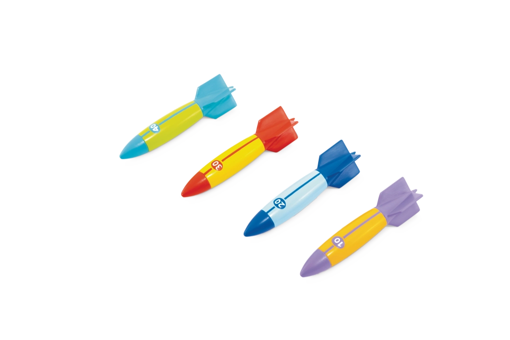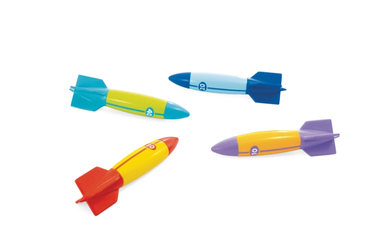 Každé torpédo má výrazné farby a číselné označenie (10/20/30/40) pre jednoduché rozlíšenie a bodovanie. Stabilizačné krídelká uľahčujú úchop aj smerovú kontrolu, takže deti dosiahnu dlhšie a presnejšie hody pod vodou – skvelé pre súťaže s kamarátmi v bazéne či na kúpalisku.
