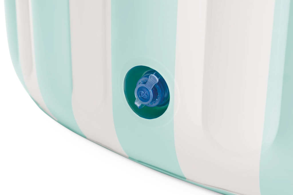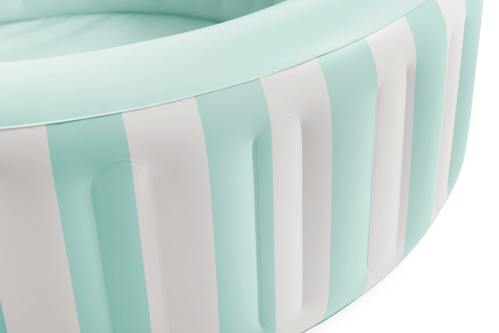Nafukovací bazénik Coastal Luxe v modernom prímorskom dizajne je ideálny na letné vodné hry menších detí. Vertikálne pruhy v svetlej tyrkysovej a bielej farbe pôsobia sviežo, zatiaľ čo hladký vnútorný povrch v jemnej tyrkysovej farbe navodzuje pocit čistoty a pokoja. Odolné PVC a viackomorové steny poskytujú stabilitu aj pohodlie pri sedení a hraní.