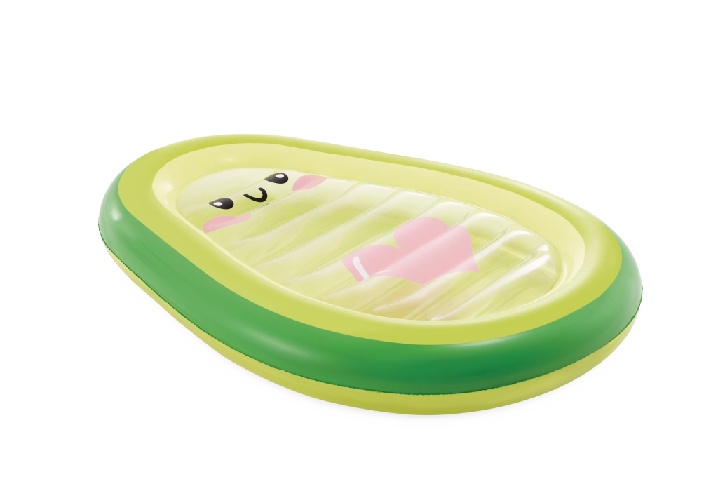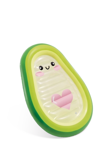 Nafukovacie ležadlo Avocado Buddy prináša do vášho letného relaxu svieži dizajn inšpirovaný avokádom. Vonkajší okraj v odtieňoch zelenej plynule prechádza do svetlejších tónov a žltej, zatiaľ čo priehľadný stred s milou kreslenou tváričkou a ružovým srdcom dodáva ležadlu originálny vzhľad. Odolné priehľadné PVC je ideálne na vodné radovánky a umožňuje pozorovať dianie pod hladinou.