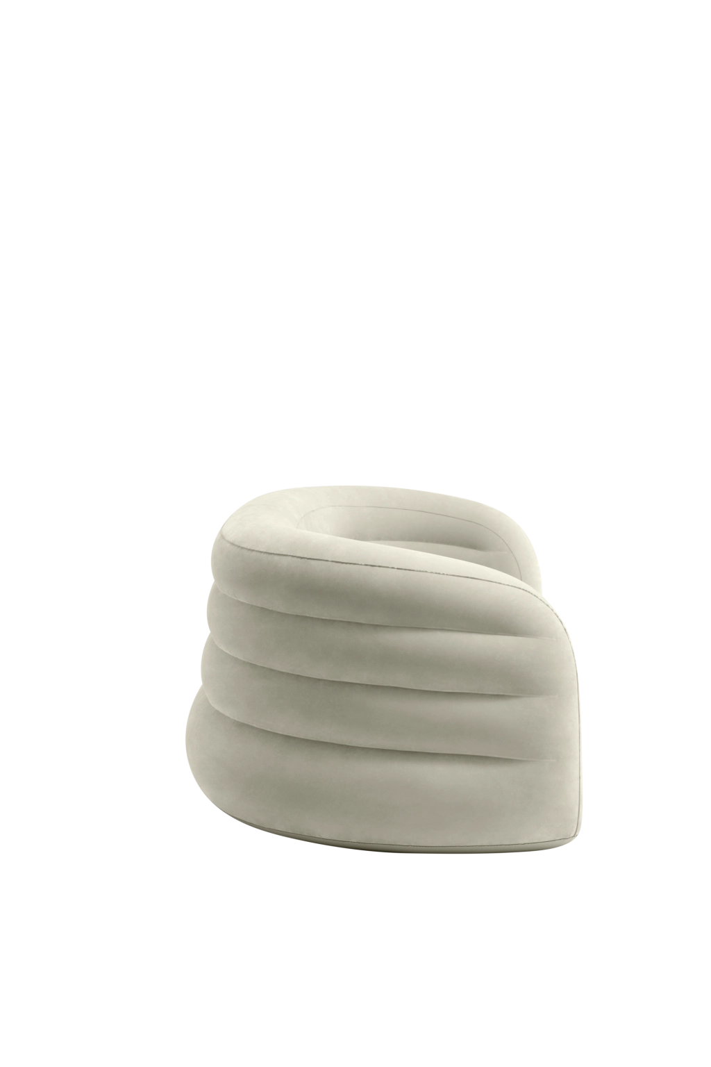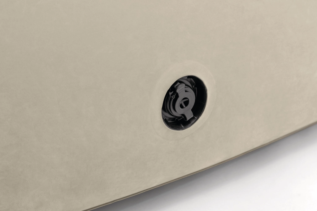 Nafukovacia pohovka Curve zaujme zaoblenými líniami, ktoré pôsobia organicky a útulne. Plyšový zamat v neutrálnom olivovo béžovom odtieni dodáva eleganciu a je príjemný na dotyk. Konštrukcia je pevná, no zároveň ľahká a jednoducho prenosná – ideálna pre flexibilné usporiadanie interiéru.