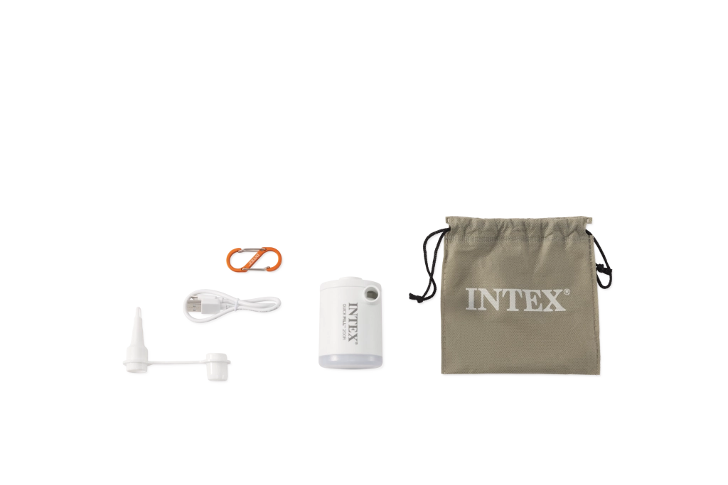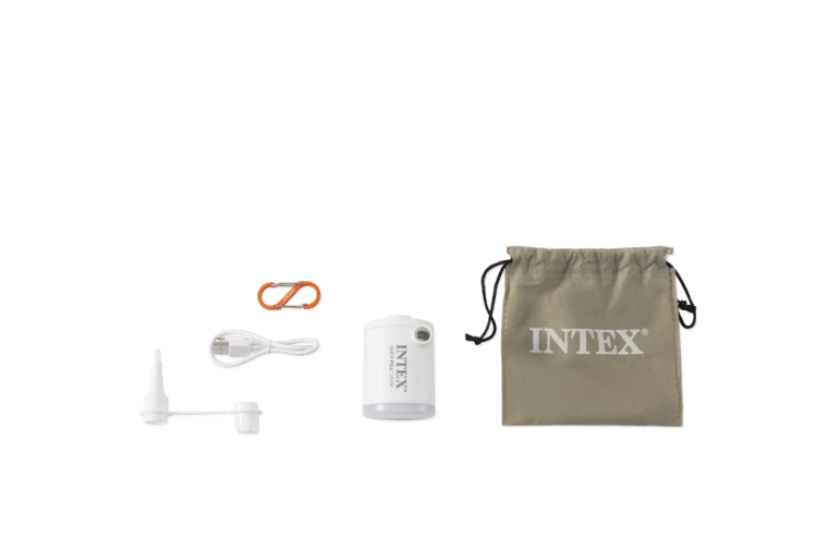 Kompaktná a ľahká elektrická pumpa Intex Quick-Fill USB 200R na rýchle nafukovanie matracov, lehátok a hračiek. Ponúka prietok až 200 l/min, nabíjanie cez USB‑C, vstavanú batériu 3,7 V a praktické LED svetlo až na 6 hodín. Vďaka karabíne ju ľahko pripnete na batoh či stan – ideálna na kempovanie aj cestovanie.