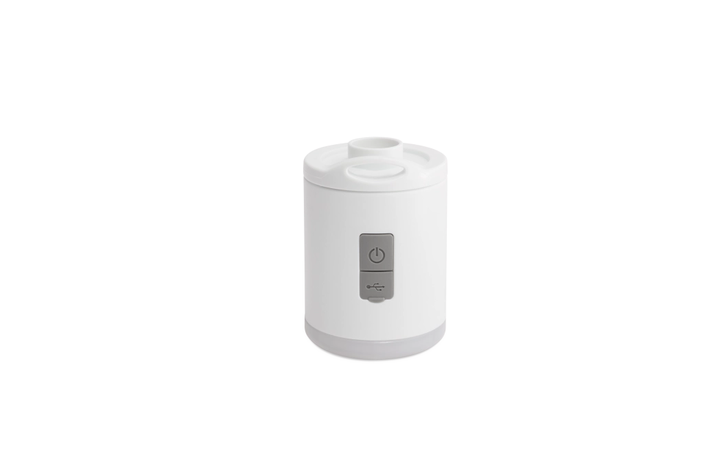 Vstavaná nabíjateľná batéria 3,7 V poskytne približne 18 minút prevádzky na jedno nabitie, USB‑C kábel je súčasťou balenia. Integrované LED svetlo s výdržou až 6 hodín poslúži ako lampáš pri večerných aktivitách aj v kempe. Ovládanie je jednoduché – jediné tlačidlo a indikátor nabíjania na boku.