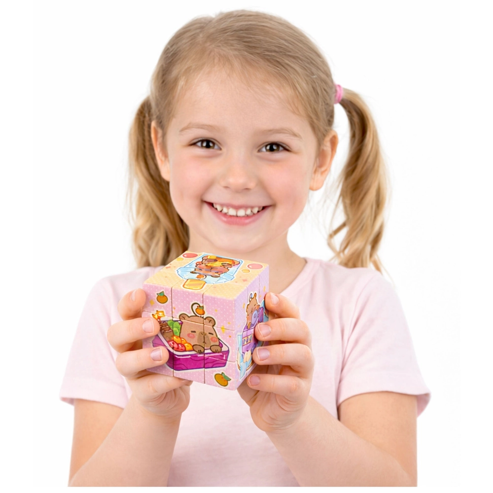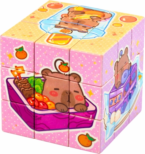 Táto farebná logická kocka s motívom kapybary je skvelou prvou hlavolamovou hračkou pre najmenších. Deti otáčaním a prekladaním segmentov skladajú na jednotlivých stranách roztomilé obrázky, čím si prirodzene trénujú postreh a trpezlivosť. Vďaka hladkým povrchom a príjemnej veľkosti sa kocka ľahko drží a motivuje ku hre znova a znova.