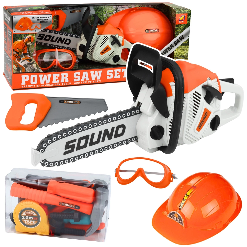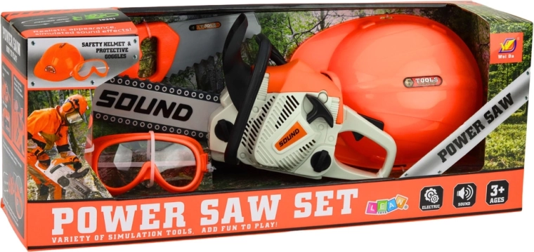 - Motorová píla so zvukmi, prilba, ochranné okuliare, rukavice, ručná píla, sada náradia
