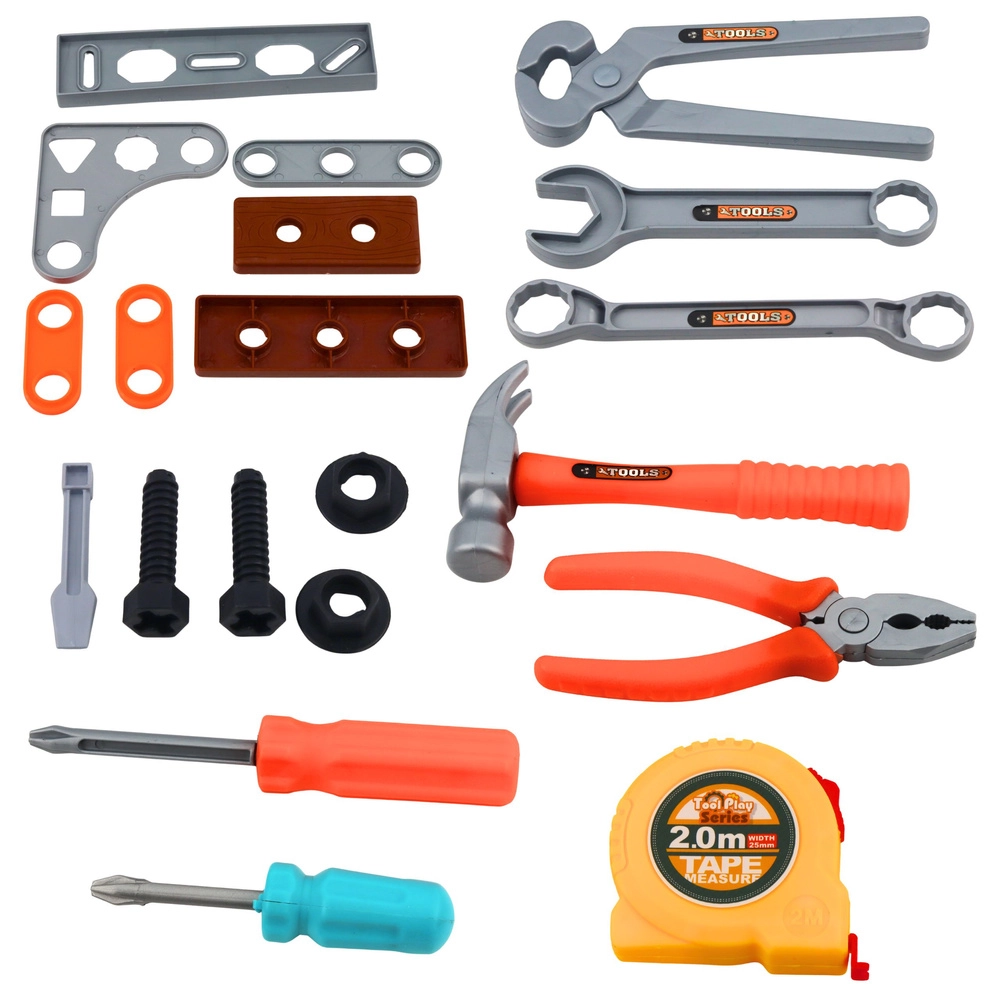 Ručná píla, kladivo, skrutkovače, kľúče a mierka rozšíria možnosti hry a rozvíjajú jemnú motoriku.
