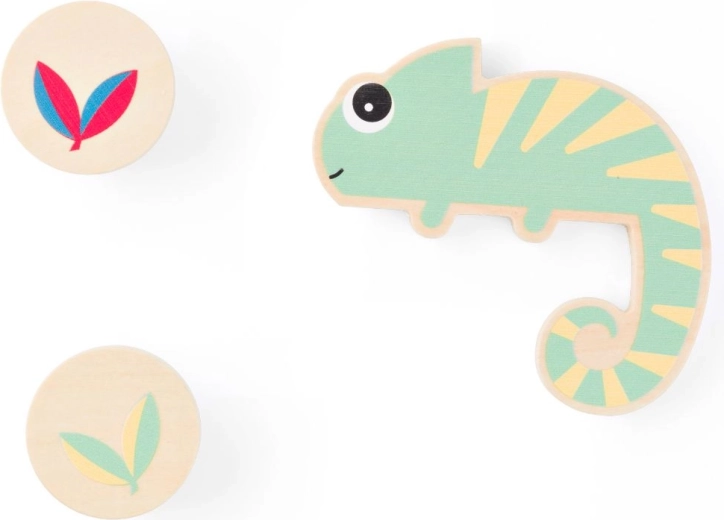Zábavná drevená hra pre 2–10 hráčov od 4 rokov, v ktorej sa snažíte prekabátiť chameleóna a nájsť list, pod ktorý sa neschová. Deti dvíhajú okrúhle drevené žetóny s listami a hľadajú také, ktoré majú dve farby, ktoré chameleón nemá. Hra ponúka tri úrovne náročnosti, trénuje pamäť a postreh a vďaka kvalitnému spracovaniu z dreva z zodpovedne obhospodarovaných lesov vydrží dlhé roky.