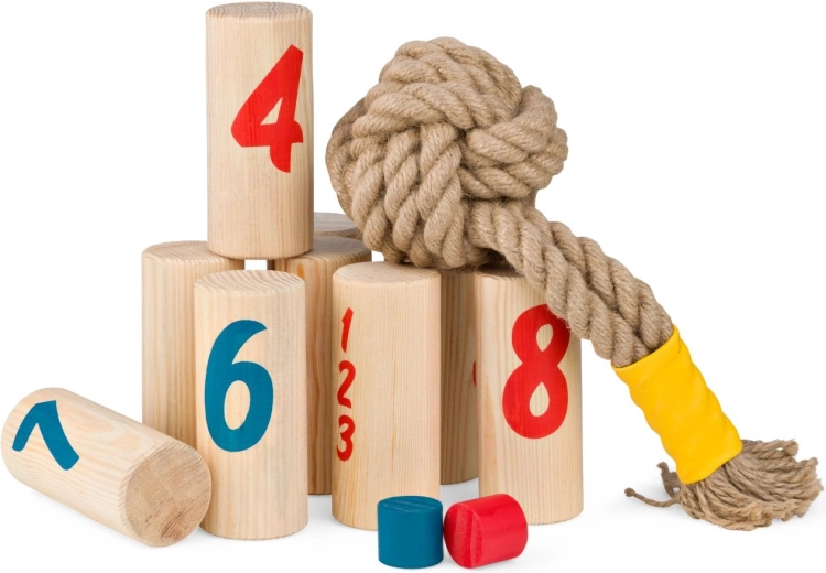 Objavte svižnú a napínavú rodinnú hru pre 2–6 hráčov od 8 rokov. Pomocou hádzacieho uzla zhadzujete očíslované drevené kolíky a zbierate body – vyhráva ten, kto ako prvý získa presne 30 bodov alebo zhodí všetky kolíky svojej farby. Hra je ideálna na záhradu aj do parku, podporuje hrubú motoriku, strategické myslenie a aktívne hranie vonku. Drevo pochádza z zodpovedne obhospodarovaných lesov.