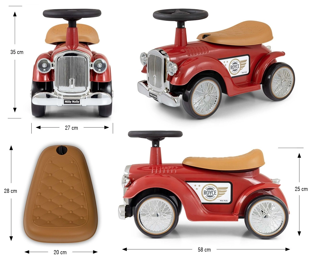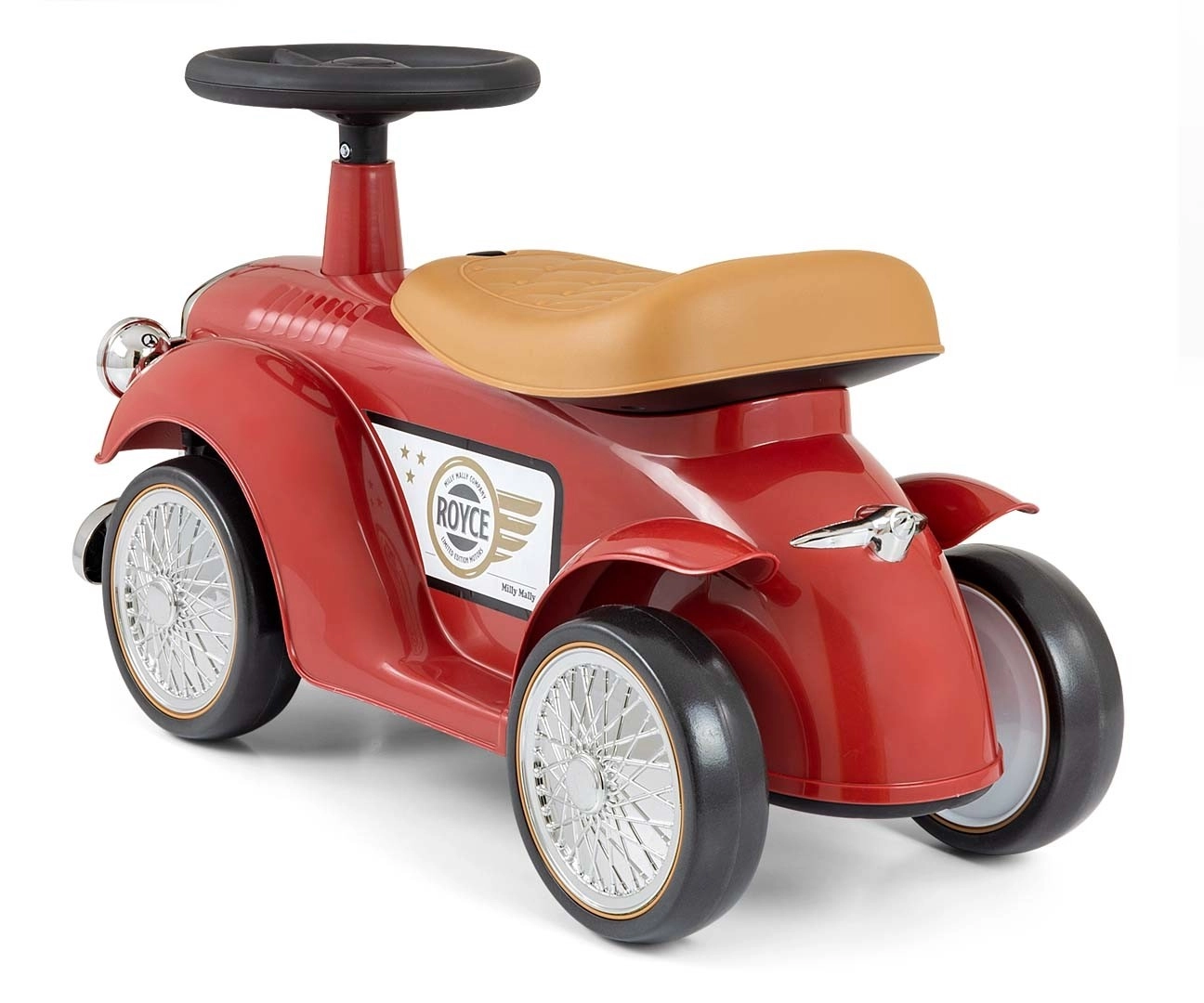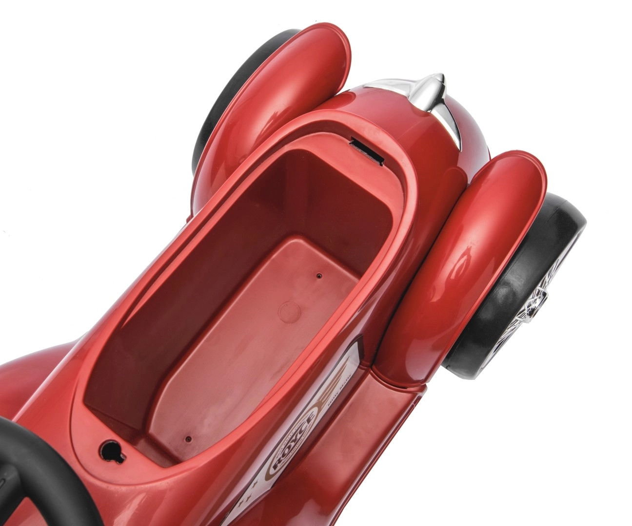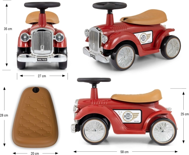 Volant s obmedzením rejdu pomáha predchádzať prevráteniu a klaksón poteší každého malého milovníka áut. Pod sedlom sa ukrýva praktický úložný priestor na drobnosti. Chrómovaný predný „gril“ a retro detaily s logom ROYCE dodávajú hračke punc nadčasového štýlu.