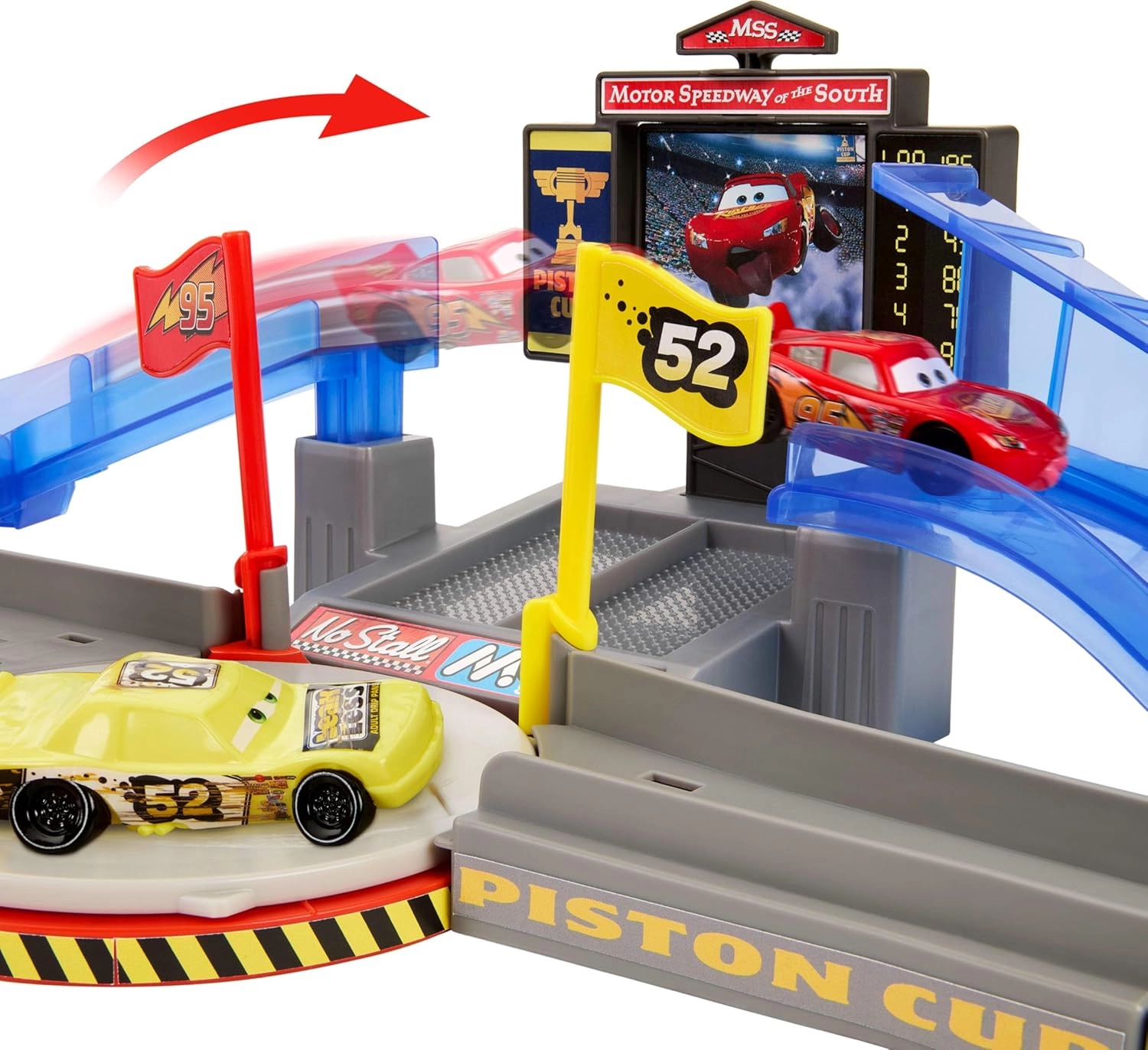 Zažite filmové momenty priamo doma. V režime ťukanca roztočíte žltú značku a pripravíte zónu stretu. Umiestnite Bleska McQueena do vystreľovača a zamierte – správny odpal znamená plynulú jazdu bez prekážok, inak dôjde k efektnému stretu s „pomačkaným“ autom. V závodnom režime prepnite výhybku, vystreľte po rampe a sledujte parádny kaskadérsky skok. Otočná obrazovka premietne hrdinu na „teletíme“ pre ešte väčšie napätie.
