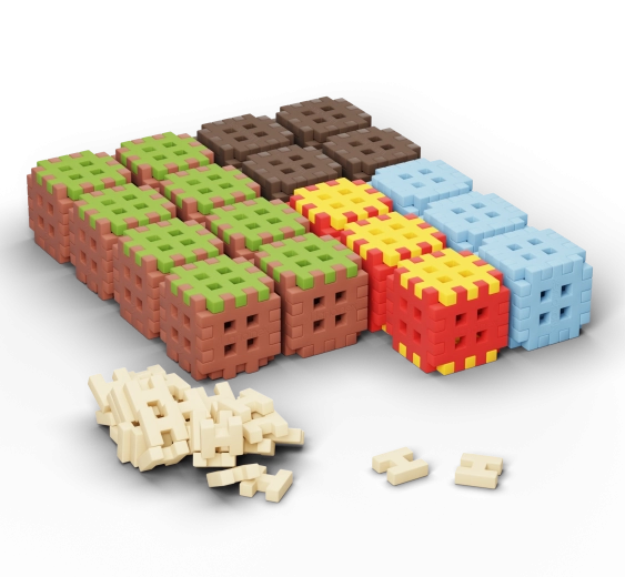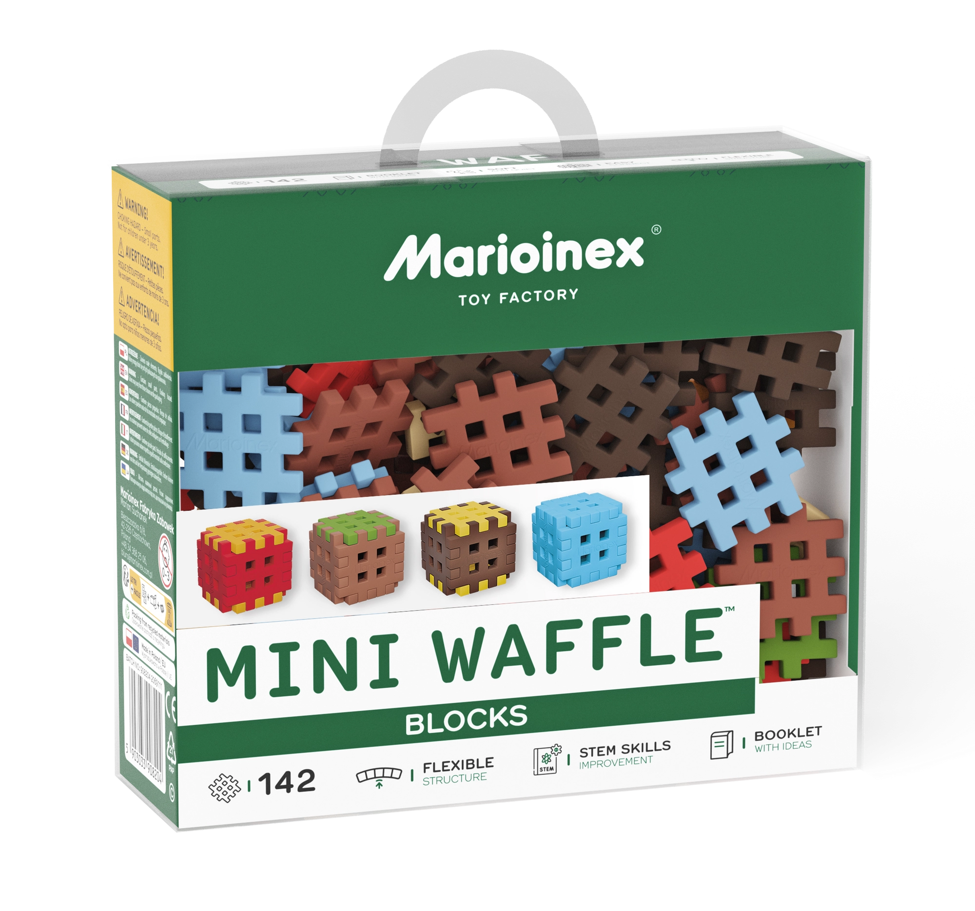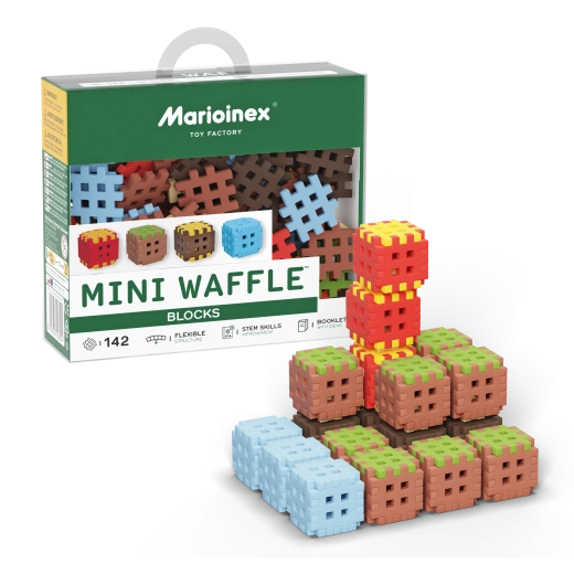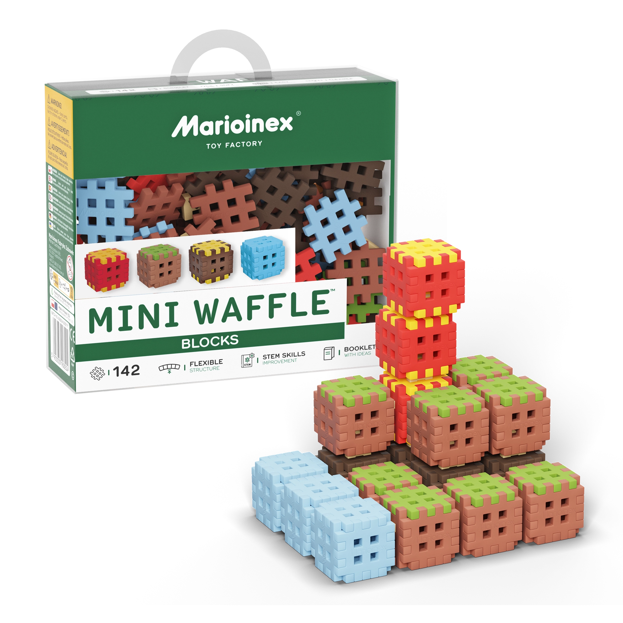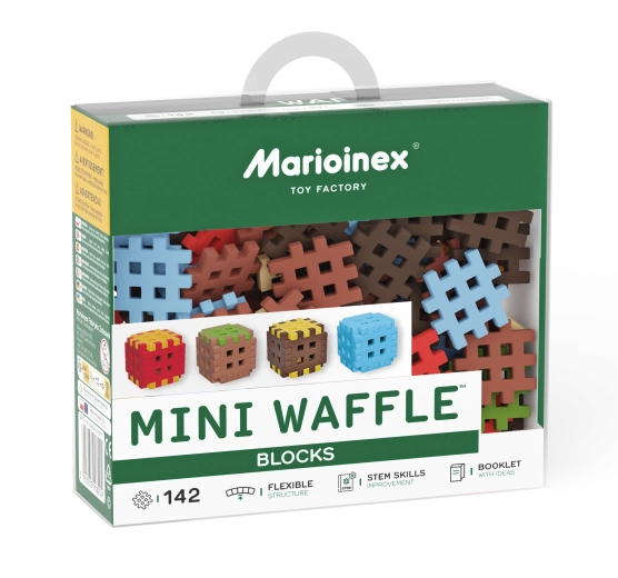 Stavebnica Mini Waffle Blocks prináša 142 farebných dielikov inšpirovaných prírodou – hnedou „zemou“, zelenou „trávou“, ľadovo modrými prvkami a energickými červeno‑žltými akcentmi. Vďaka mäkkému a pružnému materiálu sú kocky príjemné do ruky a ľahko sa spájajú aj menším deťom.